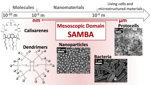 SAMBA seeks to develop an innovative bottom-up strategy to create multifunctional materials that can selectively recognize a target bacterial strain, signal its presence, and release antibiotics. The originality of the approach lies in: i) the tailored size and morphology of the carriers; ii) the use of multivalent ligands for selectivity; iii) the incorporation of multiple fluorophores for enhanced sensitivity; iv) the high antibiotic loading capacity; and v) the stimulus-triggered drug release.