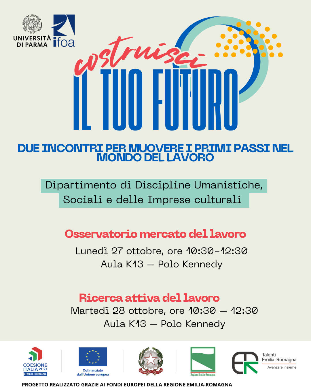 Iniziativa "UNIPR4TALENTS: Talentuosi si diventa" nell'ambito del Bando Talenti rivolta a studentesse e studenti, laureate/i, laureande/i, dottorande/i e dottoresse e dottori di ricerca del Dipartimento di Discipline Umanistiche, Sociali e delle Imprese Culturali, per far conoscere opportunità, strumenti e strategie utili per tradurre il proprio progetto professionale in un piano d’azione e entrare nel mondo del lavoro.