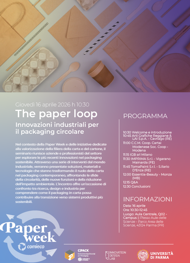 Seminar on paper recycling, with contributions from COMIECO, IREN, and the Municipality of Parma.