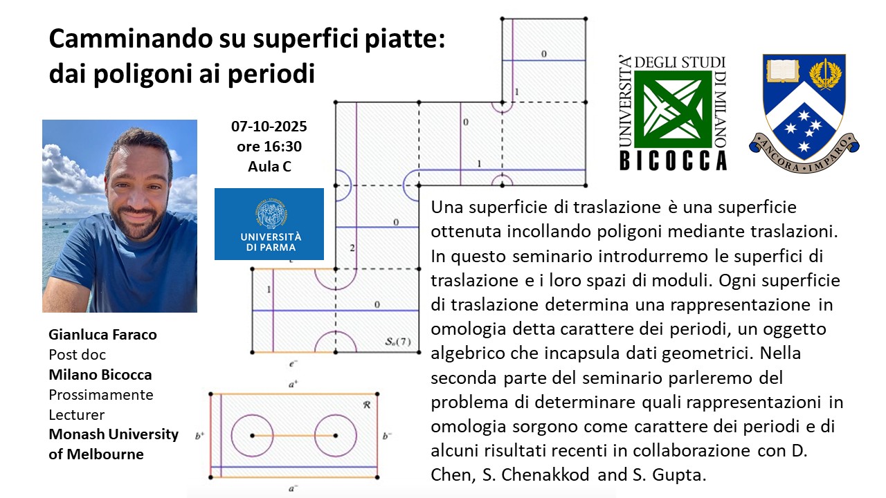Una superficie di traslazione è una superficie ottenuta incollando poligoni mediante traslazioni. In questo seminario introdurremo le superfici di traslazione e i loro spazi di moduli. Ogni superficie di traslazione determina una rappresentazione in omologia detta carattere dei periodi, un oggetto algebrico che incapsula dati geometrici. Nella seconda parte del seminario parleremo del problema di determinare quali rappresentazioni in omologia sorgono come carattere dei periodi e di alcuni risultati recenti in collaborazione con D. Chen, S. Chenakkod and S. Gupta.