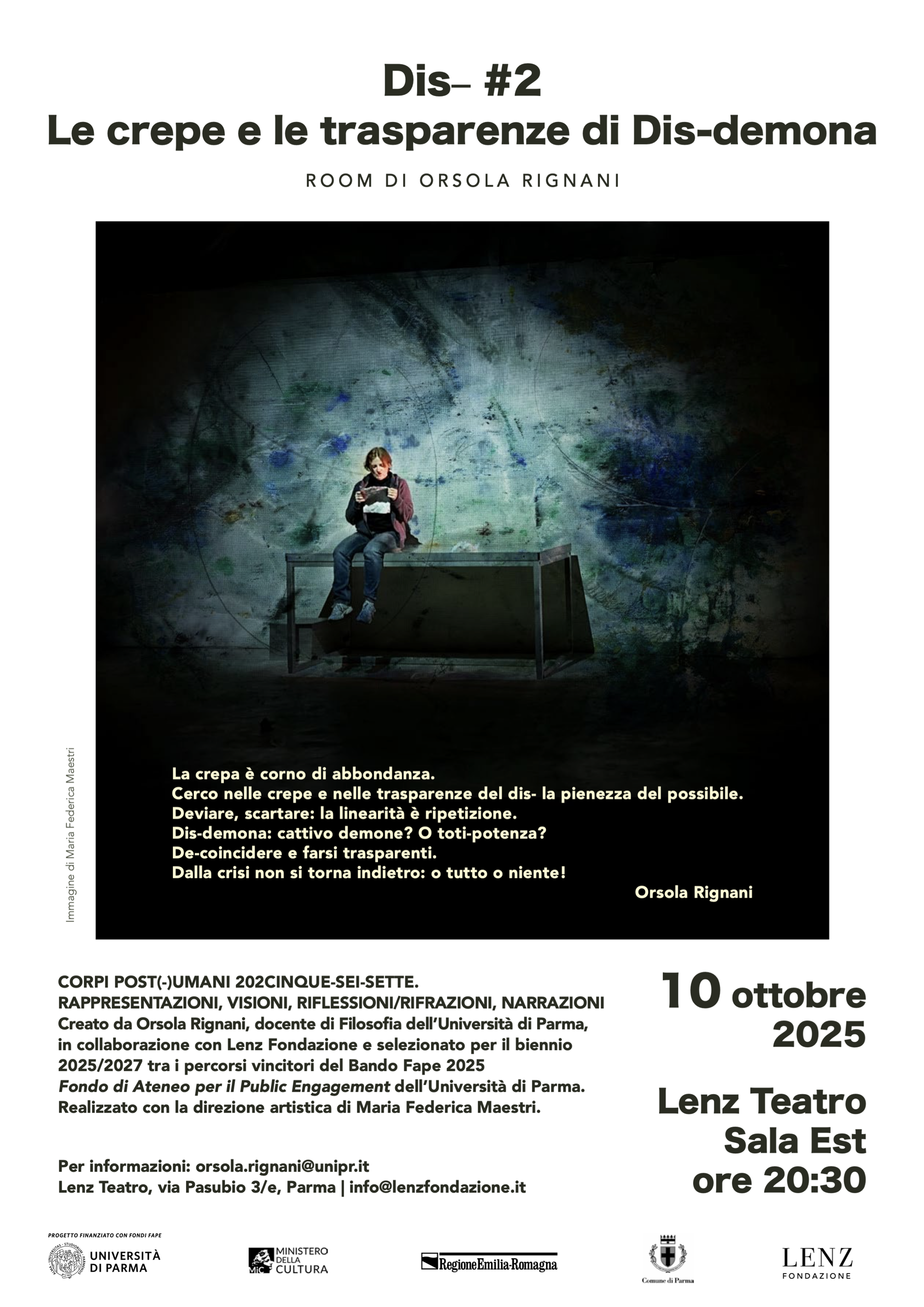 Il primo appuntamento del Progetto su CORPI POST(-)UMANI 202CINQUE-SEI-SETTE. RAPPRESENTAZIONI, VISIONI, RIFLESSIONI/RIFRAZIONI, NARRAZIONI, coordinato da Orsola Rignani e selezionato lo scorso giugno dall’Università di Parma per un finanziamento con Fondi di Ateneo per il Public Engagement (FAPE), consiste in una room/composizione filosofico-performativa a cura di Orsola Rignani dal titolo DIS- #2 LE CREPE E LE TRASPARENZE DI DIS-(DEMONA), in cui, con parole, pensieri, immagini e suoni, si sonderanno le potenzialità dis-turbanti del prefisso dis- nei confronti di una soggettività umano-centrata e di una corporeità strumentale/strumentalizzata/reificata/violata.