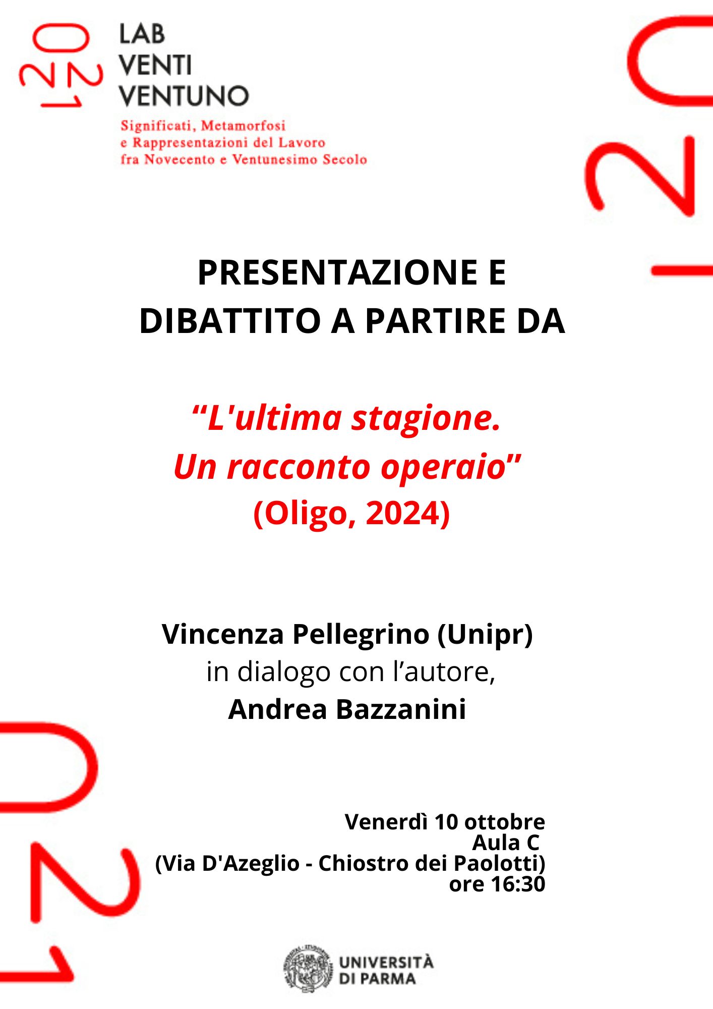 Al centro dell'incontro seminariale sarà il recente volume di Andrea Bazzanini, L'ultima stagione. Un racconto operaio (Oligo, Mantova 2024). L'autore ne ragionerà in dialogo con Vincenza Pellegrino (Unipr), che interverrà in veste di discussant.