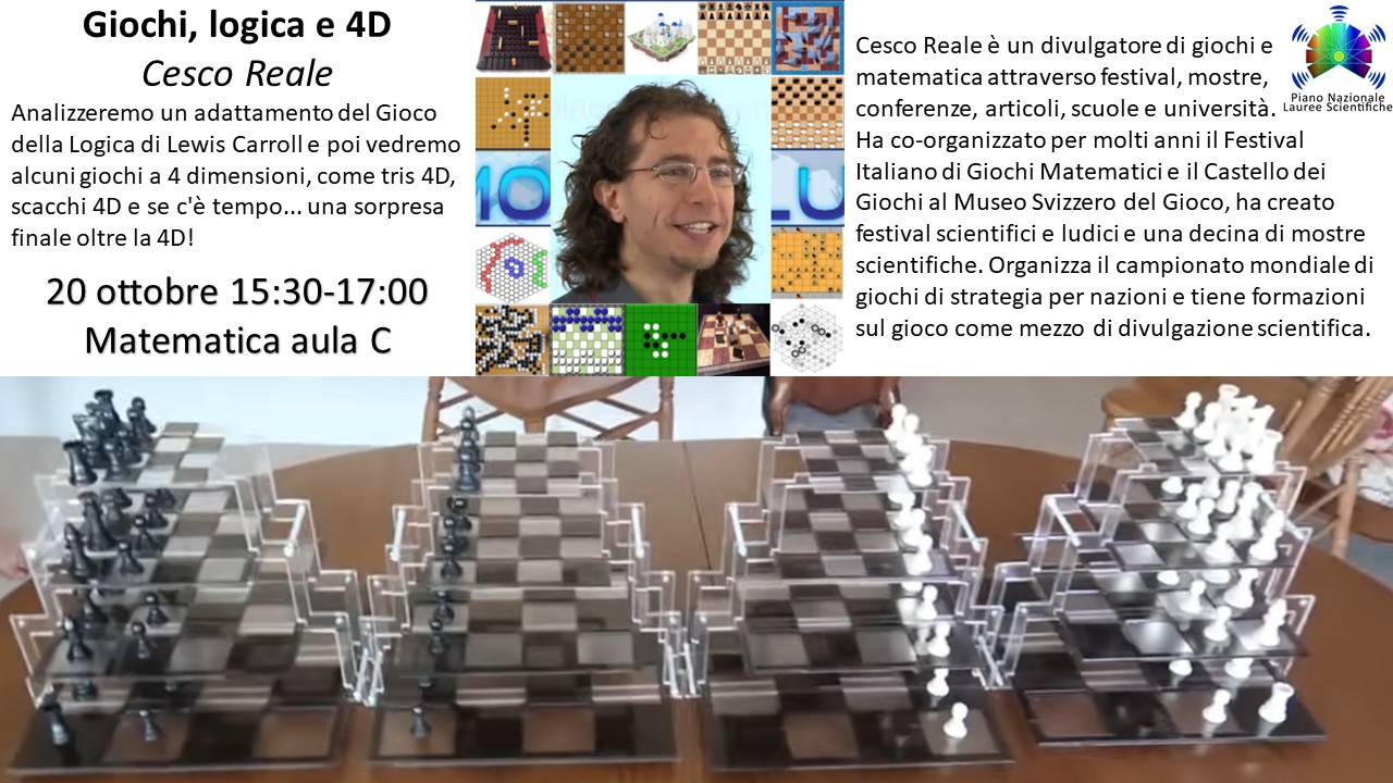 Analizzeremo un adattamento del Gioco della Logica di Lewis Carroll e poi vedremo alcuni giochi a 4 dimensioni, come tris 4D, scacchi 4D e se c'è tempo... una sorpresa finale oltre la 4D!