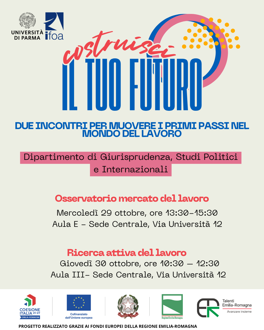 Iniziativa "UNIPR4TALENTS: Talentuosi si diventa" nell'ambito del Bando Talenti rivolta a studentesse e studenti, laureate/i, laureande/i, dottorande/i e dottoresse e dottori di ricerca del Dipartimento di Giurisprudenza, Studî Politici e Internazionali, per far conoscere opportunità, strumenti e strategie utili per tradurre il proprio progetto professionale in un piano d’azione e entrare nel mondo del lavoro.