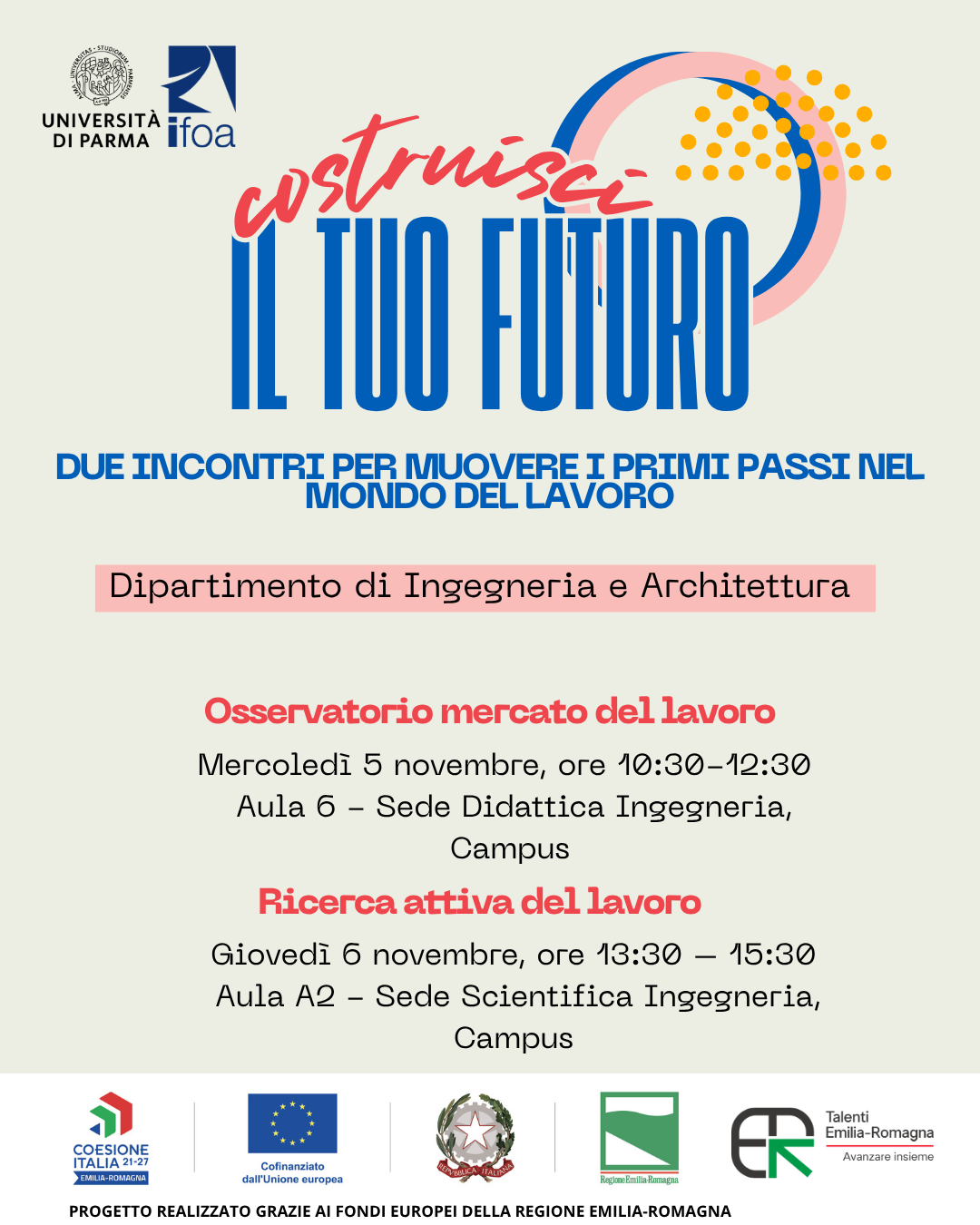 Iniziativa "UNIPR4TALENTS: Talentuosi si diventa" nell'ambito del Bando Talenti rivolta a studentesse e studenti, laureate/i, laureande/i, dottorande/i e dottoresse e dottori di ricerca del Dipartimento di Ingegneria e Architettura, per far conoscere opportunità, strumenti e strategie utili per tradurre il proprio progetto professionale in un piano d’azione e entrare nel mondo del lavoro.