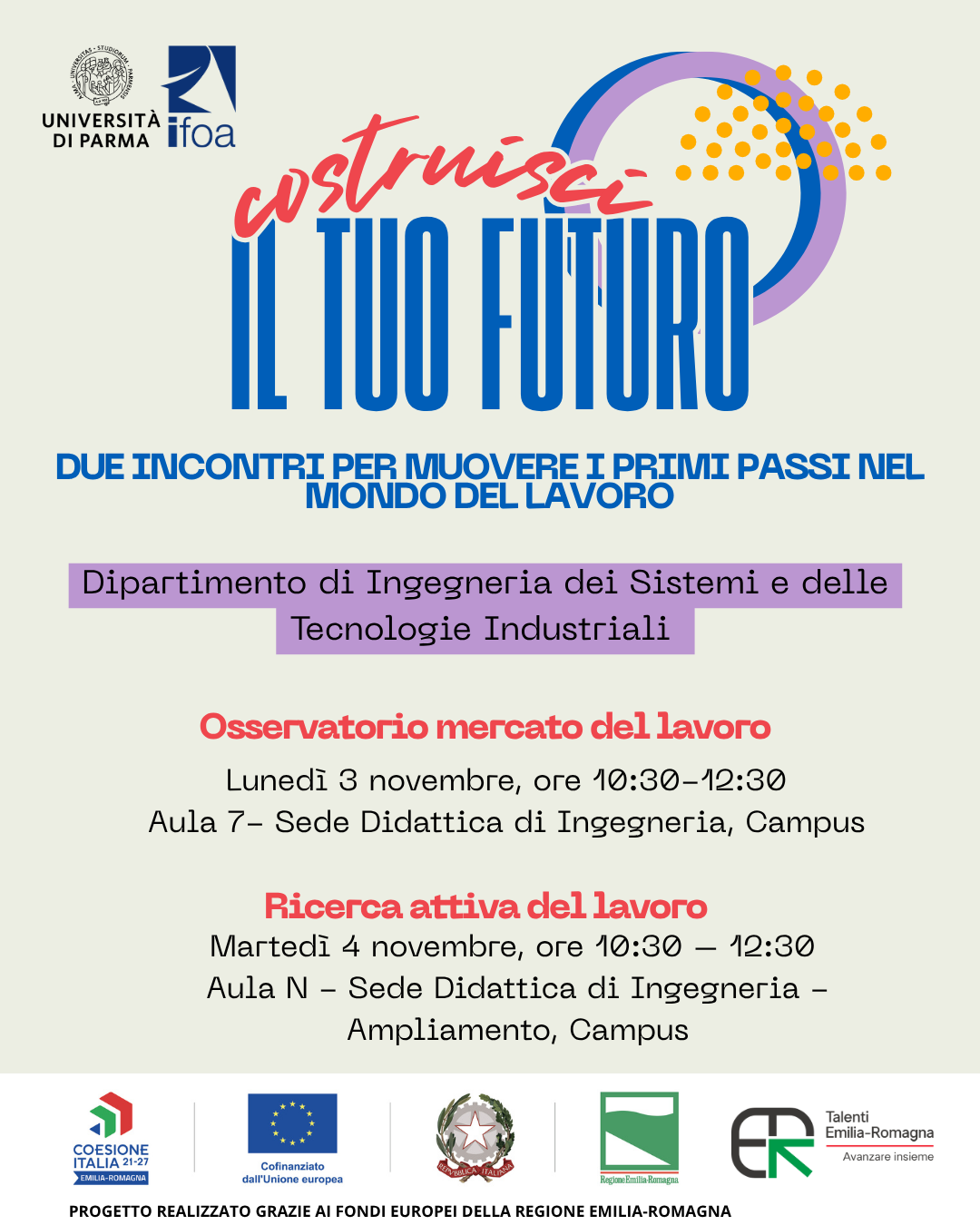Iniziativa "UNIPR4TALENTS: Talentuosi si diventa" nell'ambito del Bando Talenti rivolta a studentesse e studenti, laureate/i, laureande/i, dottorande/i e dottoresse e dottori di ricerca del Dipartimento di Ingegneria dei Sistemi e delle Tecnologie Industriali, per condividere informazioni sulle fonti più utili per cercare lavoro, sulle posizioni più in linea con il proprio background e sui trend del mercato del lavoro.