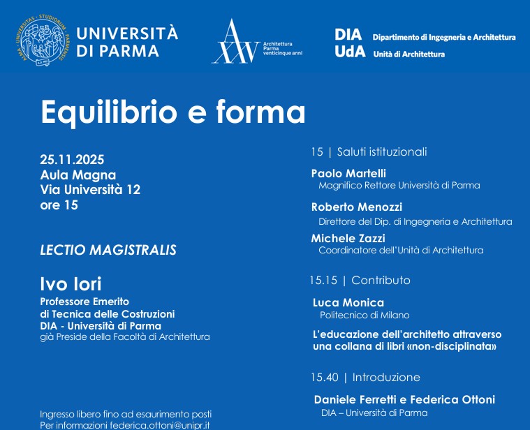 Nell’ambito delle celebrazioni del XXVennale della Scuola di Architettura dell’Università di Parma si terrà la lectio magistralis di Ivo Iori, Professore emerito di Tecnica delle Costruzioni e già Preside della ex facoltà di Architettura dell'Ateneo.