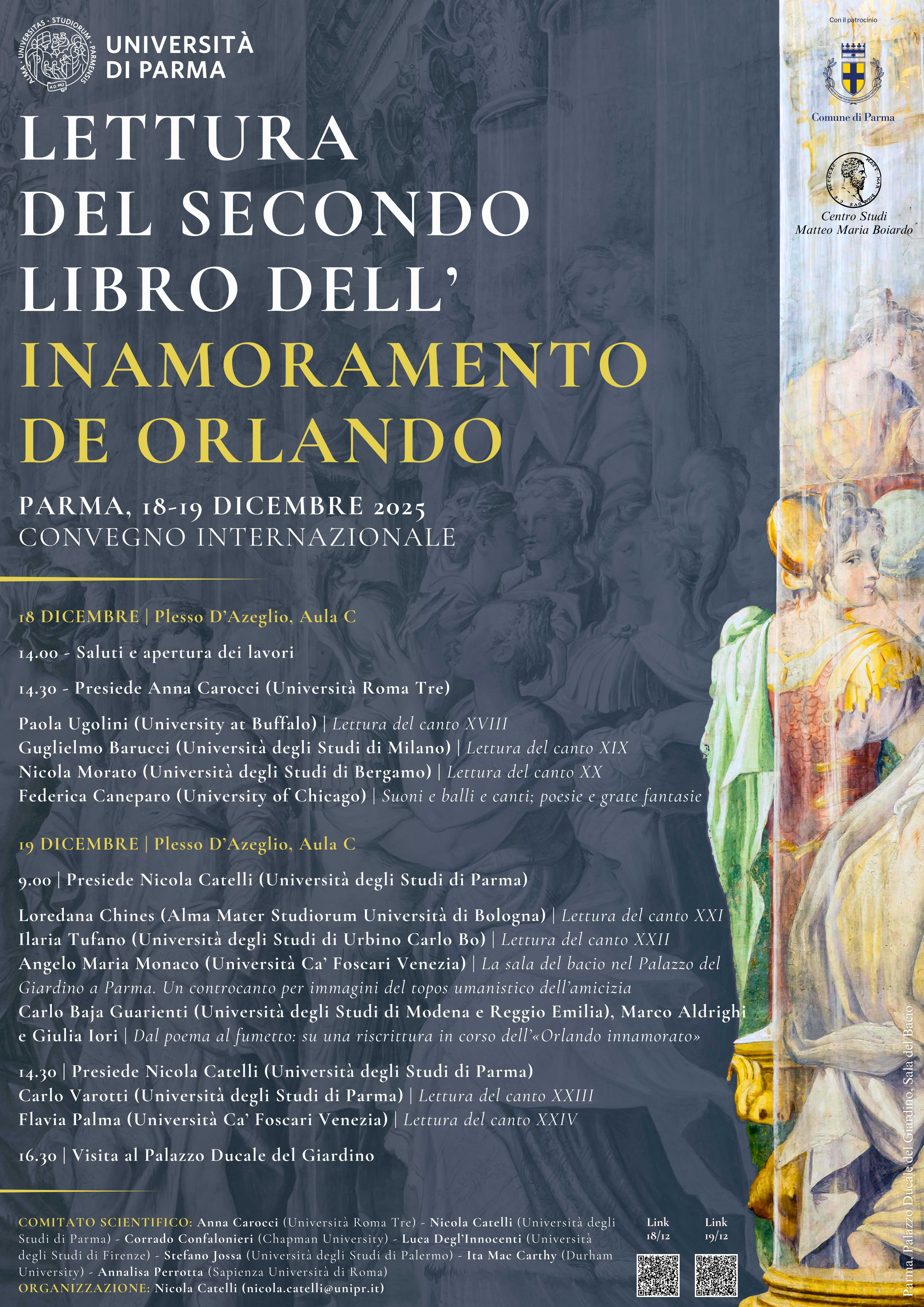 Il 18 e 19 dicembre, nell'aula C del Plesso D'Azeglio, si terrà il convegno internazionale Lettura del secondo libro dell'«Inamoramento de Orlando», organizzato da Nicola Catelli e dedicato all'interpretazione critica del poema di Matteo Maria Boiardo. Il convegno è parte di un progetto di lettura puntuale, canto per canto, del poema, che ha coinvolto vari atenei a partire dalla fine del 2023: dopo l'apertura a Scandiano, sede del Centro Studi Matteo Maria Boiardo, promotore dell'iniziativa, le letture hanno avuto luogo, per il primo libro, all'Università di Modena e Reggio Emilia, all'Università di Ferrara, all'Università Ca' Foscari di Venezia, e per il secondo libro alla Sapienza Università di Roma, all'Università Roma Tre e all'Università di Palermo. Dopo la sessione parmense, che sarà dedicata ai canti 18-24 del secondo libro del poema, le letture si concluderanno all'Università di Firenze (ultimi canti del secondo libro) e alla Durham University (canti del terzo libro). Il programma del convegno è il seguente: