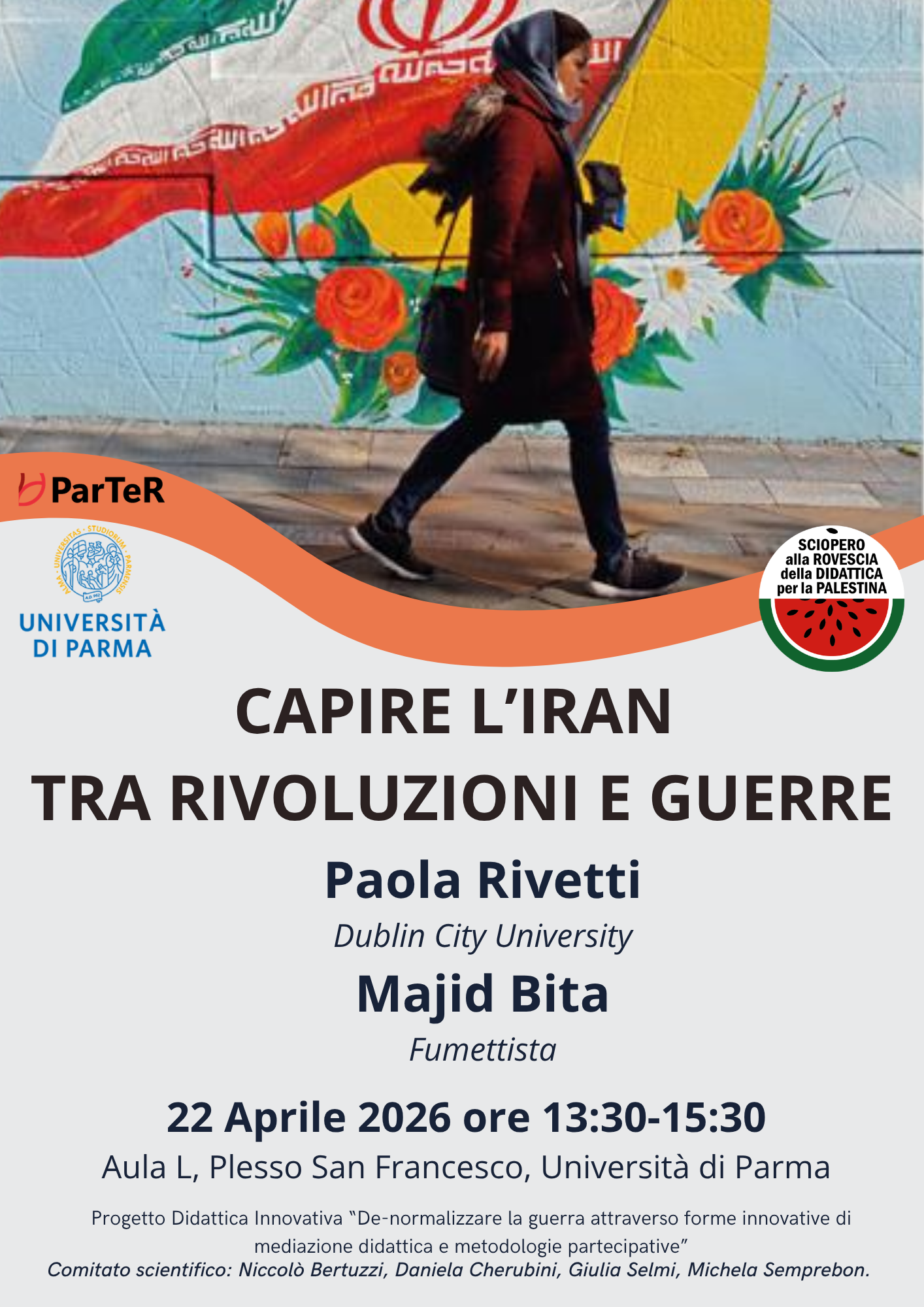 Il seminario si aprirà con gli interventi di Paola Rivetti, professoressa di Politica e Relazioni Internazionali all’Università di Dublino, autrice di “Storia dell’Iran. Rivoluzione, Guerra e Resistenza 1979-2025” (Laterza, 2026) e “Political Participation in Iran from Khatami to the Green Movement” (Palgrave, 2020) e di Majid Bita, fumettista e illustratore, autore di “L’autobus incantato” (Canicola edizioni, 2025) e “Nato in Iran” (Canicola edizioni, 2023). Seguirà uno spazio di domande e interazione con il pubblico.