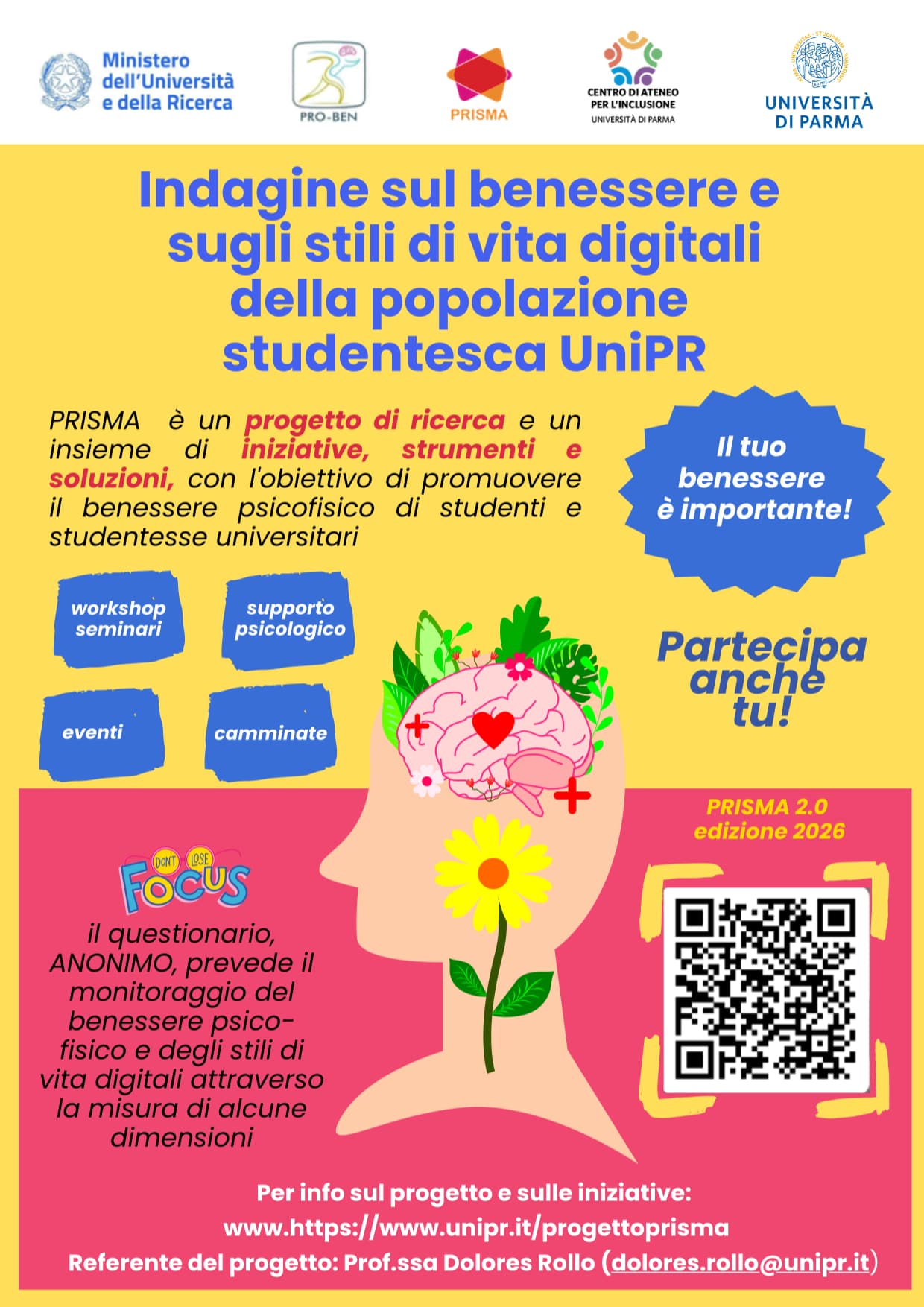 La compilazione del questionario da parte di studenti e studentesse ci aiuterà a comprendere  fattori di rischio come, ad esempio, stili di vita disfunzionali, e di protezione, il senso di appartenenza, la grinta accademica e il supporto sociale, al fine di dare un ulteriore contributo, in termini di ricerca, al counseling psicologico, alle azioni del Centro di Ateneo per l’inclusione, a beneficio di tutti e tutte.