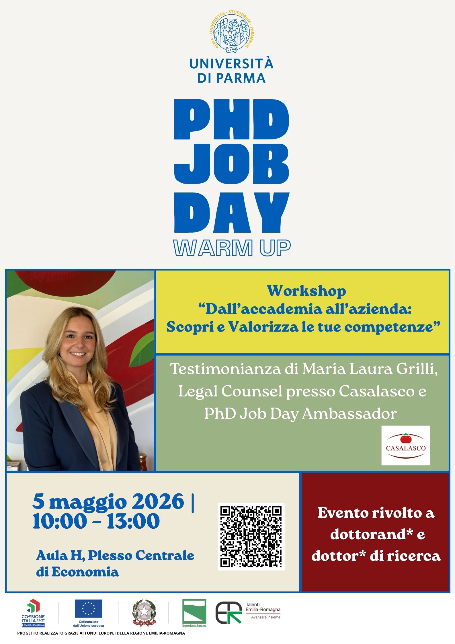 Durante l’incontro, interverrà Maria Laura Grilli, Legal Counsel presso Casalasco e PhD Job Day Ambassador, che condividerà la sua esperienza personale. Racconterà della sua partecipazione alla prima edizione del PhD Job Day, di come quella occasione le abbia permesso di entrare in contatto con l’azienda per cui attualmente lavora e di come sia riuscita a trasformare quell’incontro in una concreta opportunità lavorativa. La sua storia sarà un esempio concreto di come preparazione, comunicazione e networking possano aprire nuove strade nel mondo professionale.