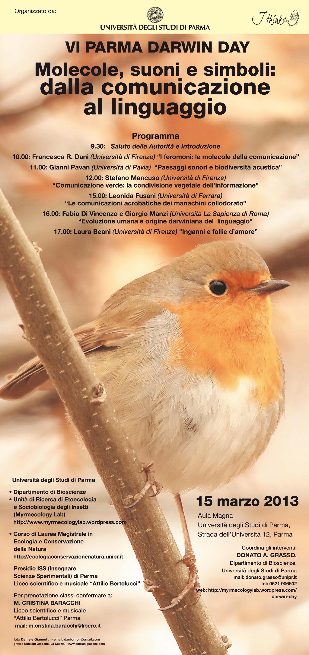 Dopo i saluti delle autorità interverranno Donato GrassoUniversità di Parma, Francesca R. Dani, Università di Firenze, Gianni Pavan, Università di Pavia, Stefano Mancuso, Università di Firenze, Leonida Fusani, Università di Ferrara, Fabio Di Vincenzo e Giorgio Manzi, Sapienza - Università di Roma e Laura Beani, Università di Firenze.