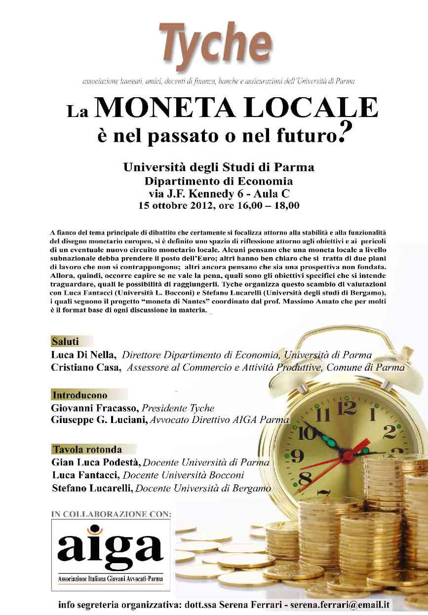 Parma 12 ottobre 2012 – Lunedì 15 ottobre, alle ore 16, presso l’Aula C del Dipartimento di Economia dell’Università di Parma (via J.F. Kennedy, 6), si terrà il convegno "La moneta locale è nel passato o nel futuro?" organizzato dal Dipartimento di Economia dell’Ateneo.