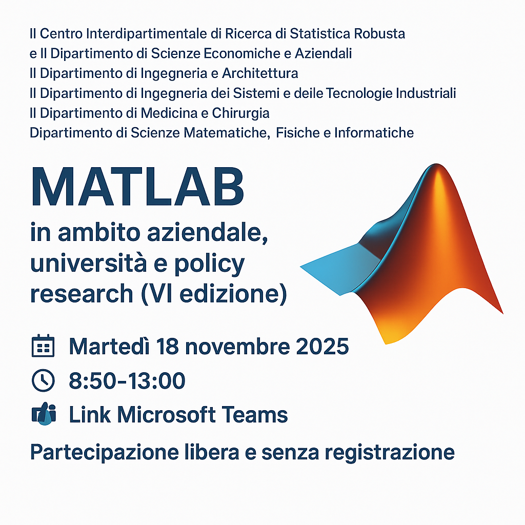 Parma, 6 novembre 2025 – Martedì 18 novembre alle 8.50 è in programma, su piattaforma Teams, la sesta edizione del webinar MATLAB in ambito aziendale, università e policy research, organizzato dal Centro Interdipartimentale di Ricerca di Statistica Robusta dell’Università di Parma e dai Dipartimenti di Scienze Economiche e Aziendali, di Ingegneria e Architettura, di Ingegneria dei Sistemi e delle Tecnologie Industriali, di Medicina e Chirurgia e di Scienze Matematiche, Fisiche e Informatiche con il patrocinio della Società Italiana di Matematica Applicata e Industriale.