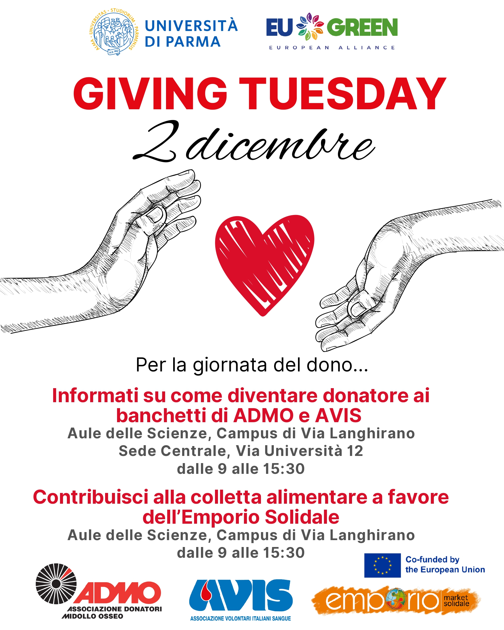 In occasione del Giving Tuesday l’Ateneo, nell’ambito delle iniziative EU GREEN, insieme ad AVIS Parma, ADMO Emilia-Romagna ed Emporio Solidale di Parma, invita studentesse, studenti e personale a scoprire il valore del volontariato e a sostenere, con un gesto concreto, chi vive situazioni di difficoltà.