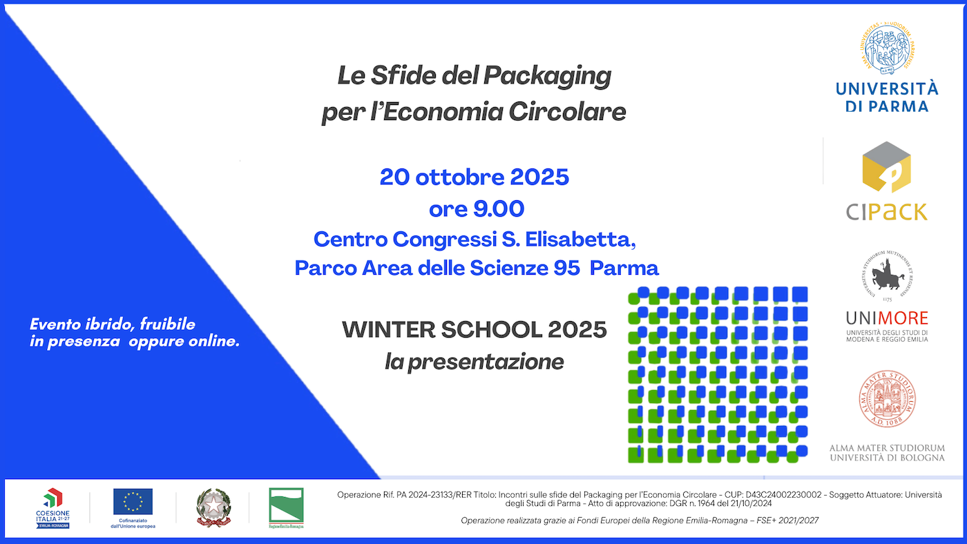 Parma, 7 ottobre 2025 – È in programma per lunedì 20 ottobre alle 9 al Centro Sant’Elisabetta dell’Università di Parma (Campus Scienze e Tecnologie) la presentazione della Winter School Le sfide del packaging per l’economia circolare, il programma di alta formazione promosso dall’Università di Parma in collaborazione con le Università di Bologna e Modena e Reggio Emilia e realizzato con il sostegno della Regione Emilia-Romagna e dei fondi europei nell’ambito delle azioni di alta formazione (DGR 1625/2021).