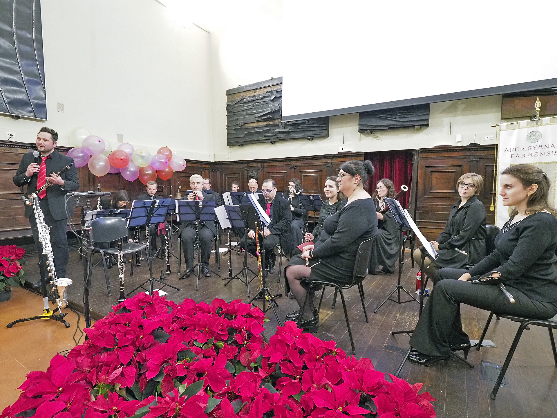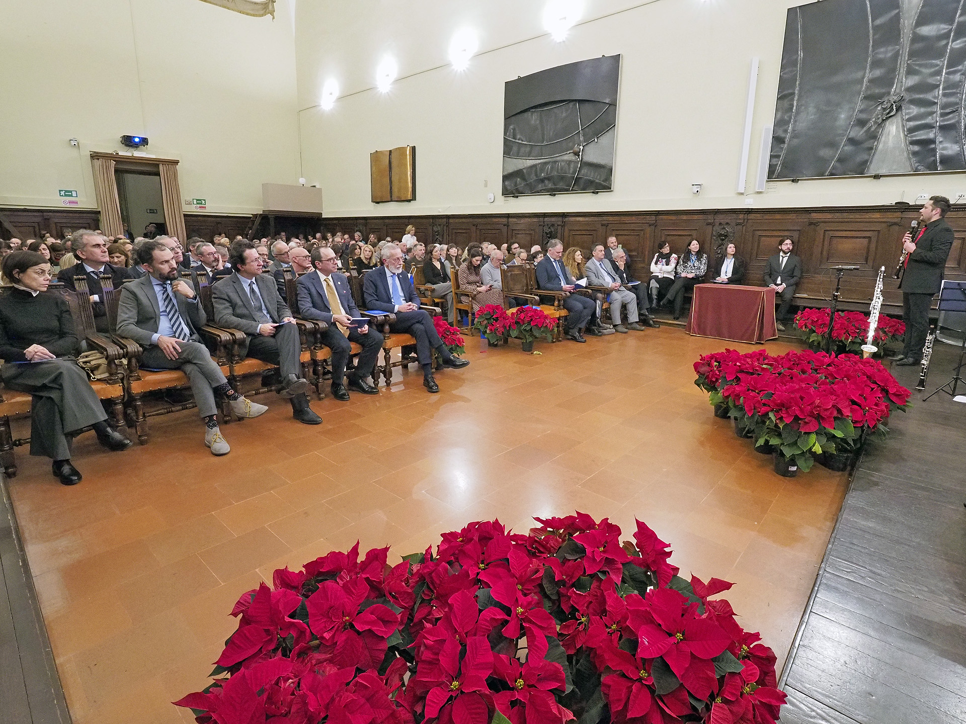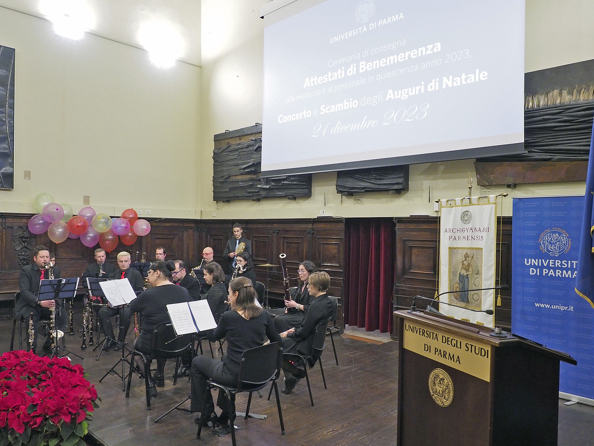 La consegna è stata preceduta dall’intervento del Rettore Paolo Martelli, ed è stata seguita da un concerto della Sezione fiati dell’Orchestra dell’Università di Parma, diretta dal Maestro Stefano Zinetti, e dallo scambio degli auguri in vista delle prossime festività.