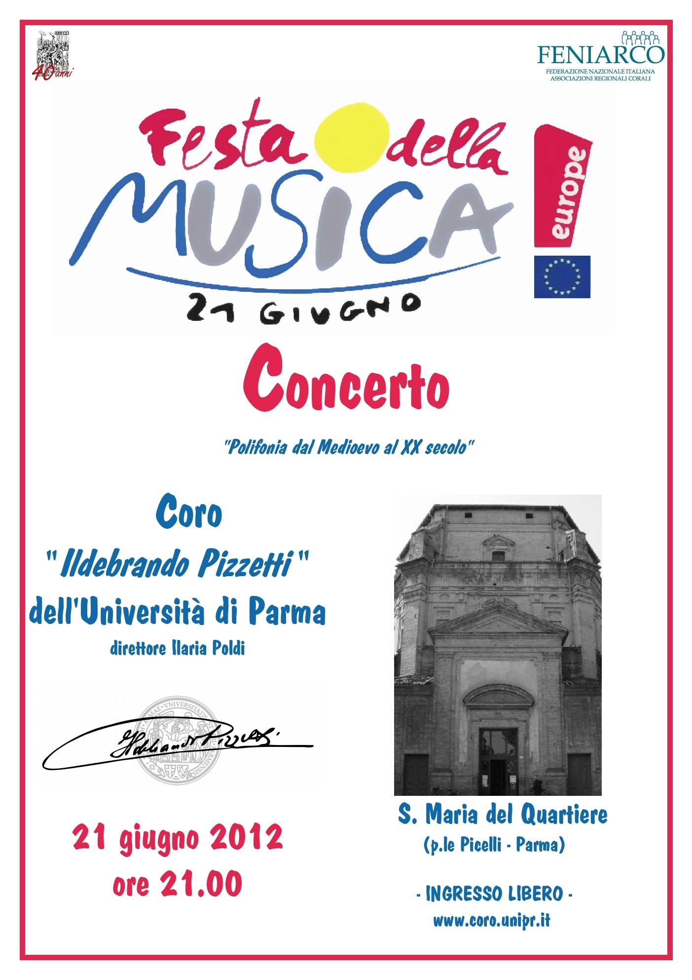 Parma, 15 giugno 2012 – Giovedì 21 giugno, alle ore 21, presso la chiesa di S. Maria del Quartiere (p.le Picelli – Parma), il Coro “I. Pizzetti” dell’Università di Parma si esibirà nel concerto a ingresso gratuitoPolifonia dal Medioevo al XX secolo”, in occasione della "Festa della Musica Europea".