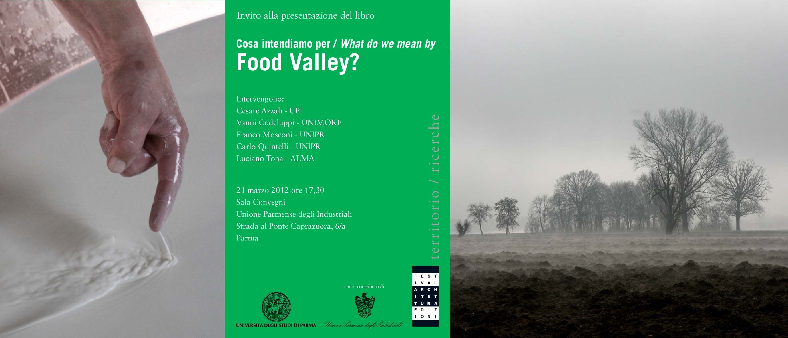 Parma, 15 marzo 2012 - Mercoledì 21 marzo, alle ore 17.30, presso la sala conferenze dell’Unione Parmense Industriali (Strada al Ponte Caprazucca, 6/a - Parma), si terrà la presentazione del volume Cosa intendiamo per Food Valley? (edito da Festival Architettura Edizioni), curato dal prof. arch. Carlo Quintelli, docente presso la Facoltà di Architettura dell’Università di Parma.