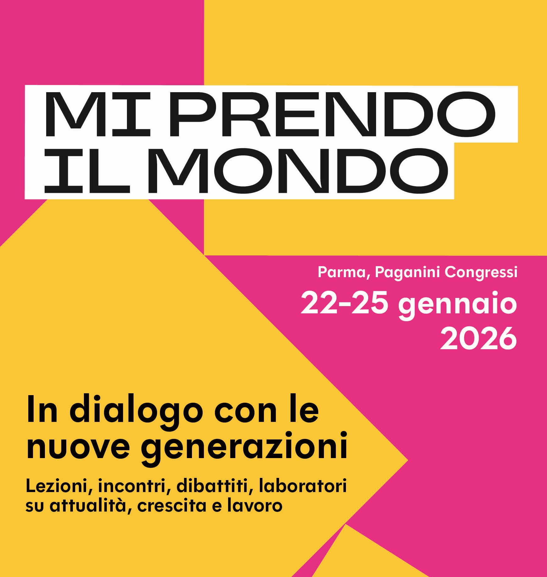 Ultimo aggiornamento 20 gennaio 2026 - Con lo stesso spirito ricco di energia e coraggio che ha animato le precedenti edizioni, torna a Parma – European Youth Capital 2027 – l’iniziativa “Mi prendo il mondo. In dialogo con le nuove generazioni ”, che mette al centro i giovani e la loro capacità di guardare al futuro. Si svolgerà da giovedì 22 a domenica 25 gennaio 2026 al Paganini Congressi, con un’anteprima giovedì 15 gennaio. È ideata dalle ragazze e dai ragazzi riuniti nella “Direzione Futura” e dal Salone Internazionale del Libro di Torino, in collaborazione con la Città di Parma, con il sostegno di Regione Emilia-Romagna e Fondazione Cariparma e con il patrocinio dell’Università di Parma e di Rai.