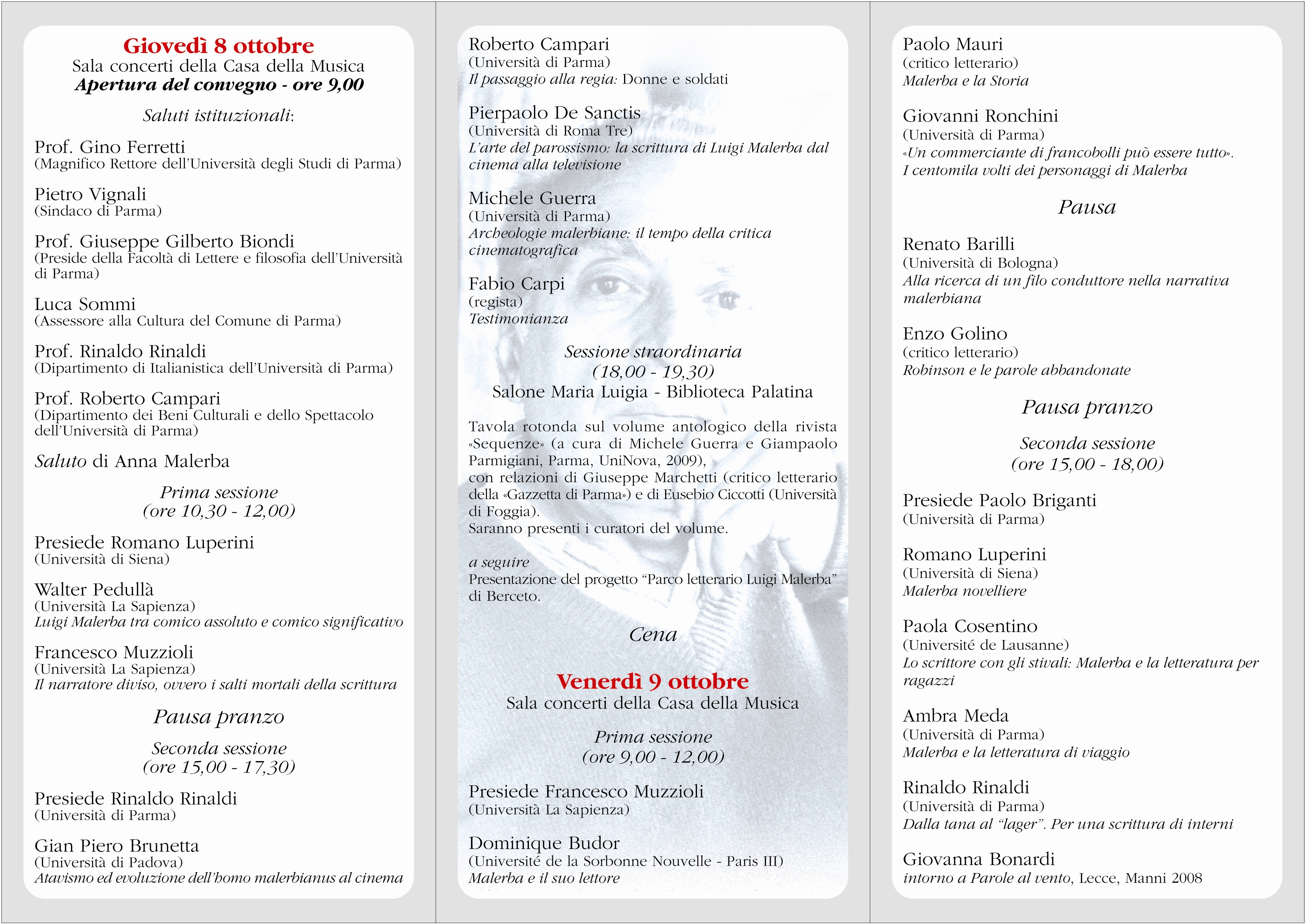 8-9 OTTOBRE: CONVEGNO INTERNAZIONALE DI STUDI A RICORDO DI LUIGI MALERBADurante il convegno sarà presentata l'antologia di «Sequenze»,rivista di critica cinematografica fondata e diretta da Luigi MalerbaProgrammaGiovedì 8 e venerdì 9 ottobre, presso la Sala concerti della Casa della Musica (piazzale San Francesco 1, Parma), il Dipartimento di Beni Culturali e dello Spettacolo e il Dipartimento di Italianistica dell'Università degli Studi di Parma insieme all'Assessorato alla Cultura del Comune di Parma, organizzano un Convegno a ricordo dell'intellettuale parmense Luigi Malerba, nato a Berceto nel 1927, a circa un anno dalla sua scomparsa.Al Convegno, che sarà aperto dai saluti del Rettore dell'Ateneo Gino Ferretti, del Sindaco di Parma Pietro Vignali, del Preside della Facoltà di Lettere e Filosofia Giuseppe Biondi e dell'Assessore alla Cultura del Comune di Parma Luca Sommi, parteciperanno, oltre alla vedova e alla figlia dello scrittore, i principali esperti dell'opera di Malerba: Walter Pedullà, Romano Luperini, Francesco Muzzioli, Paolo Mauri, Enzo Golino, Renato Barilli, Paola Cosentino, Rinaldo Rinaldi, Dominque Budor, per il versante letterario, e Gian Piero Brunetta e Roberto Campari, per quello cinematografico.Nel corso del Convegno sarà presentata, in una sessione straordinaria presso la Biblioteca Palatina, alla presenza di Giuseppe Marchetti ed Eusebio Ciccotti, l'antologia di «Sequenze», rivista di critica cinematografica fondata e diretta da Malerba uscita a Parma dal 1949 al 1951, curata da Michele Guerra e Giampaolo Parmigiani e edita da UniNova.Per informazioni:Segreteria organizzativa - Dipartimento di Italianistica (Università di Parma), via D'Azeglio 85/A, 43100 Parma, tel. 0521/032374 fax 0521/032360, italiano@unipr.itParma, 5 ottobre 2009