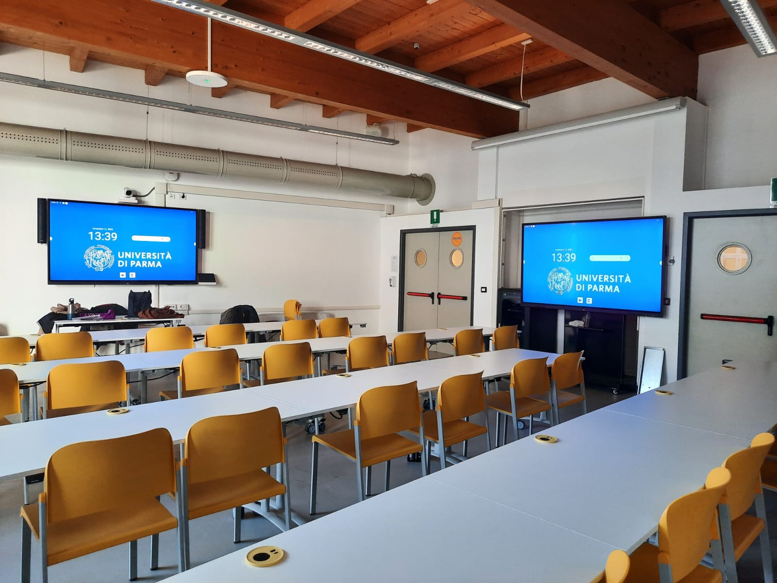 • Due monitor touch interattivi - Il monitor principale è utilizzato dal/dalla docente per condividere contenuti (slide, lavagna condivisa ecc.) e per attività con studentesse e studenti. Studentesse e studenti possono collegarsi e condividere materiali direttamente sul monitor, ad esempio durante lavori di gruppo o individuali. Il secondo monitor mostra studentesse e studenti collegati da remoto via Teams, così da integrarle/i nella lezione come se fossero presenti in aula. Si può scrivere con la penna in dotazione oppure anche con le dita e cancellare con il palmo della mano riproducendo a tutti gli effetti una lavagna tradizionale, ma con la possibilità anche di salvare e condividere quanto scritto sulla lavagna in formato digitale.