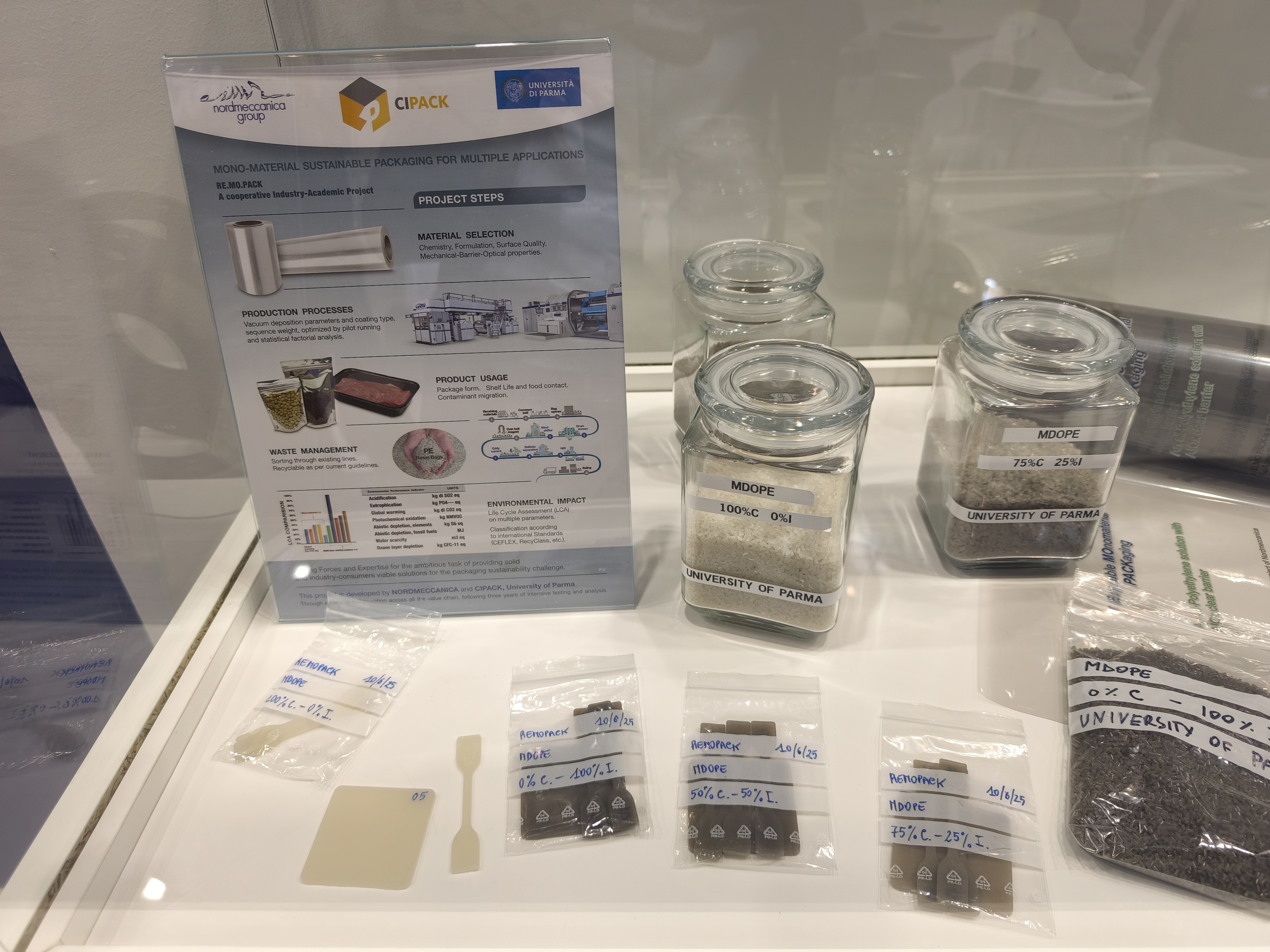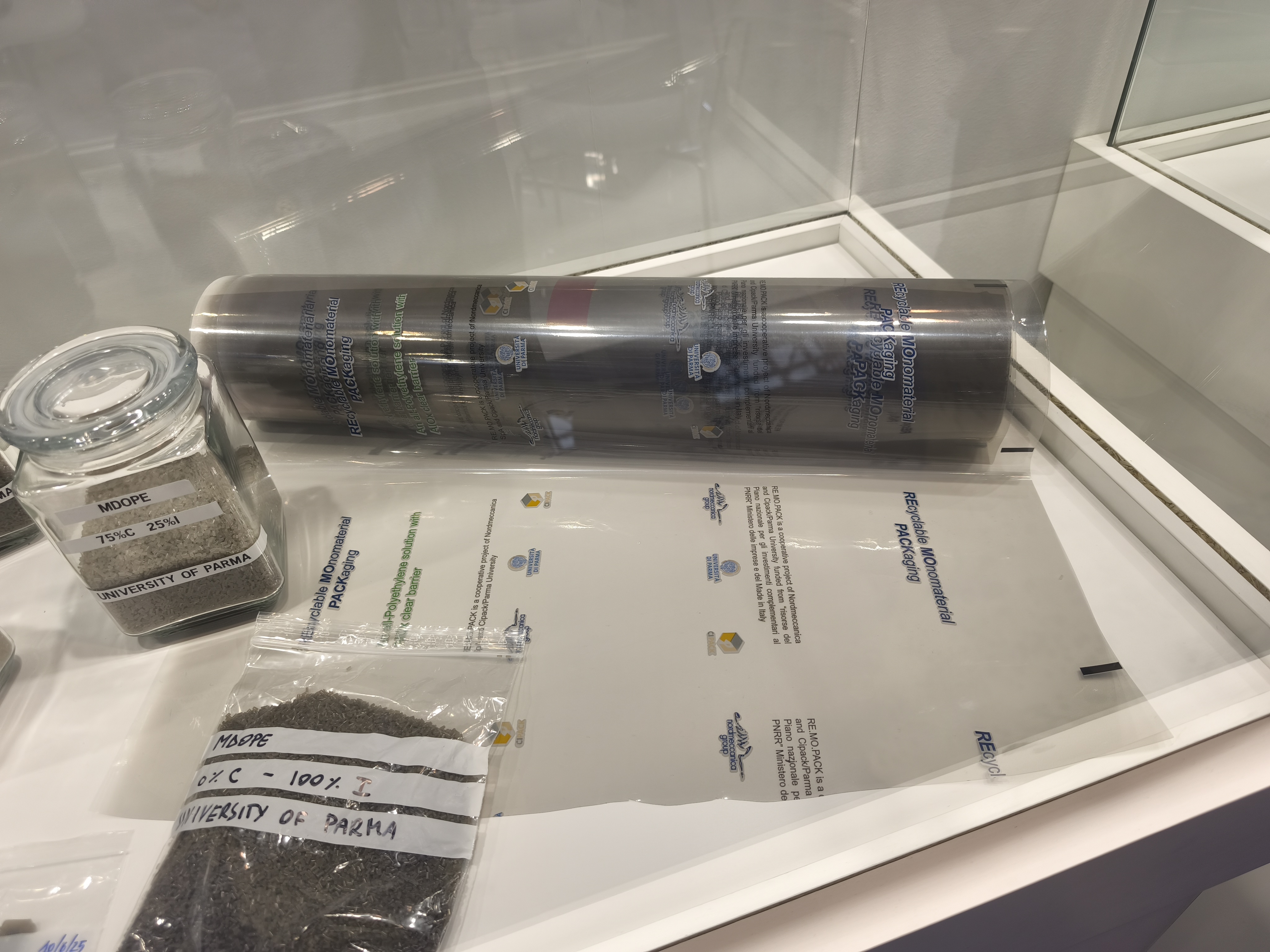 Allo stand Nordmeccanica sono stati presentati campioni di MDOPE, prototipi di film e provini per la caratterizzazione meccanica e barriera. La presenza di dimostratori fisici ha consentito ai visitatori e alle visitatrici di toccare con mano i progressi del progetto e comprendere la fattibilità industriale dell’approccio monomateriale.