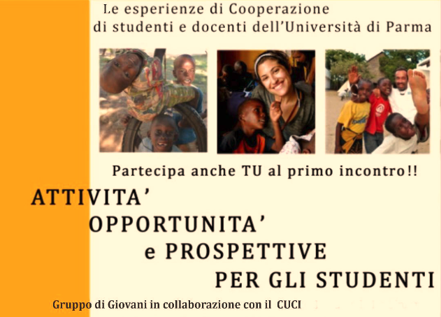 Da mercoledì 8 marzo a mercoledì 10 maggio 2017 si terrà un ciclo di seminari in cui verranno illustrate le attività del Centro Universitario per la Cooperazione Internazionale (CUCI) dell’Ateneo di Parma, diretto dal prof. Leopoldo Sarli. Nel corso degli incontri verrà presentato il gruppo di studenti e docenti che collabora con il Centro, gli obiettivi e le attività (passate, presenti e future) del gruppo e verrà promosso un momento di riflessione sulla cooperazione internazionale, anche attraverso testimonianze sul campo.I seminari, organizzati dagli studenti che collaborano con il CUCI, si terranno all’Erasmus and International Home dell'Università di Parma, in piazzale San Francesco 3, con inizio alle ore 18.Negli incontri verranno illustrate le opportunità esistenti per gli studenti dell’Università di Parma in tema di internazionalizzazione, sia attraverso lo svolgimento di periodi di ricerca o tirocini all’estero sia attraverso la collaborazione nelle attività che il CUCI svolge sul territorio in ambito di cooperazione internazionale.Mercoledì 8 marzo“La cooperazione nell’Università di Parma: attività, opportunità e prospettive per gli studenti”Gruppo di studenti in collaborazione con il CUCIGiovedì 16 marzo“Crescere oltre i confini: le esperienze in ambito sanitario degli studenti dell’Università di Parma”Studenti dell’Università di Parma che hanno svolto un’esperienza di tirocinio e/o ricerca all’estero nell’ambito della cooperazione internazionale Mercoledì 22 marzo“Crescere oltre i confini: le esperienze in ambito economico e umanistico degli studenti dell’Università di Parma”Studenti dell’Università di Parma che hanno svolto un’esperienza di tirocinio e/o ricerca all’estero nell’ambito della cooperazione internazionale Giovedì 6 aprile“La collaborazione dell’Università e delle Associazioni locali di cooperazione in Senegal"Laura Fieschi (Università di Parma), Nadia Monacelli (CUCI), Carlotta Valesi (Mani)Mercoledì 19 aprile"La cooperazione internazionale in ambito sanitario"Paolo Villani (Direttore della struttura complessa Pediatria Generale e d'Urgenza dell'Azienda Ospedaliero-Universitaria di Parma), Lucia Chierici (Associazione Ruvuma), Bertrand Tchana (Dirigente Medico Pediatra -Cardiologo presso Azienda Ospedaliero-Universitaria di Parma)Mercoledì 10 maggio“Ruolo dell’università nella cooperazione internazionale per lo sviluppo”Leopoldo Sarli (Direttore del Centro Universitario per la Cooperazione Internazionale - CUCI)Si prega gentilmente di confermare la partecipazione all’indirizzo email: info.cooperazione@unipr.it Al termine del ciclo di incontri verrà rilasciato un attestato di partecipazione, con un minimo di presenza a quattro incontri.