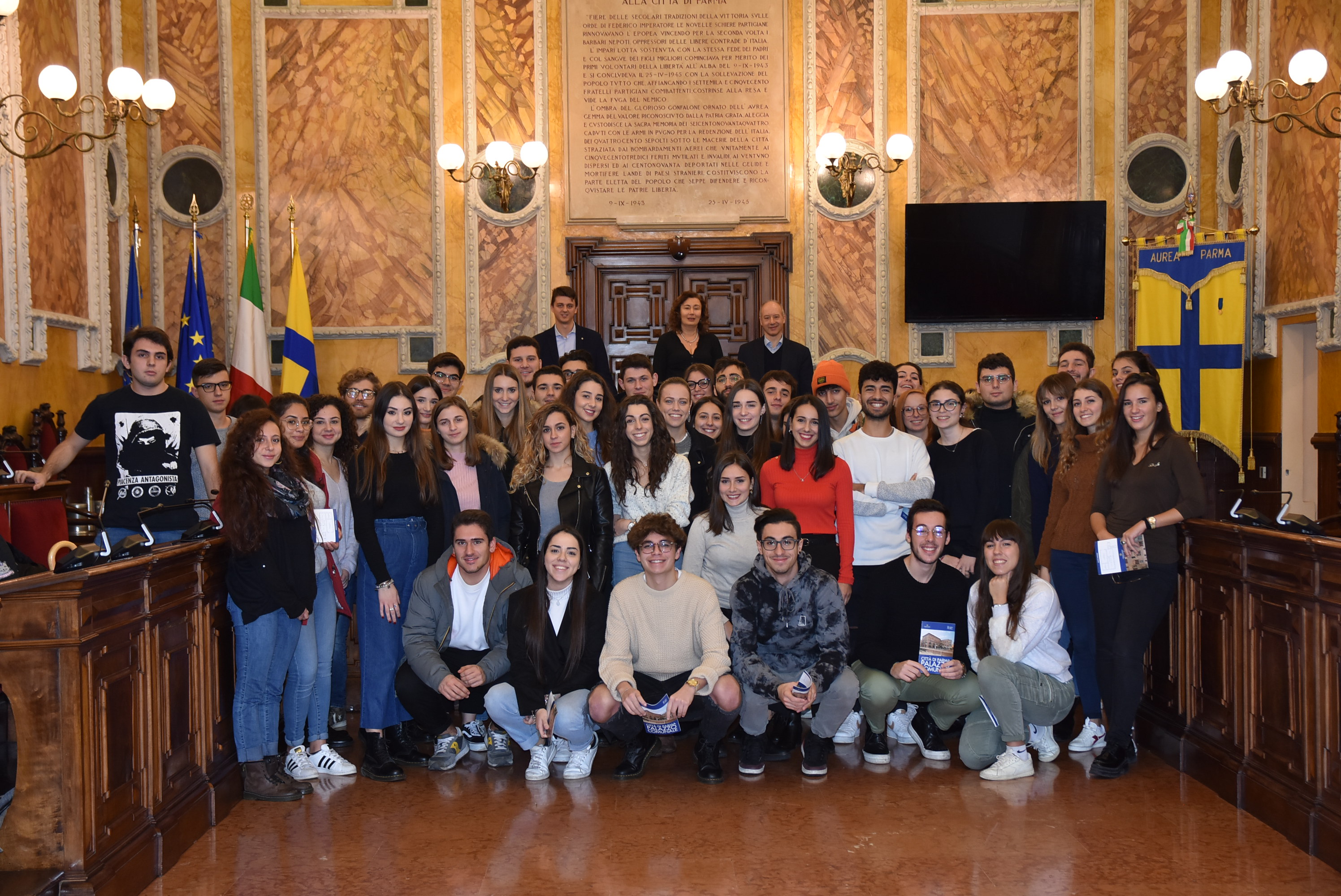 Parma, 3 dicembre 2019Visita in Consiglio comunale per gli studenti del corso di Ingegneria gestionale dell'Università di Parma. Per iniziativa di Monica Cocconi, docente di Diritto amministrativo al Dipartimento di Ingegneria e Architettura, gli studenti sono stati in Municipio, accolti dal Vice Presidente del Consiglio comunale Sandro Maria Campanini e dal Consigliere incaricato con deleghe ai Rapporti con le rappresentanze studentesche, Partecipazione giovanile e Welfare dello studente universitario Leonardo Spadi.