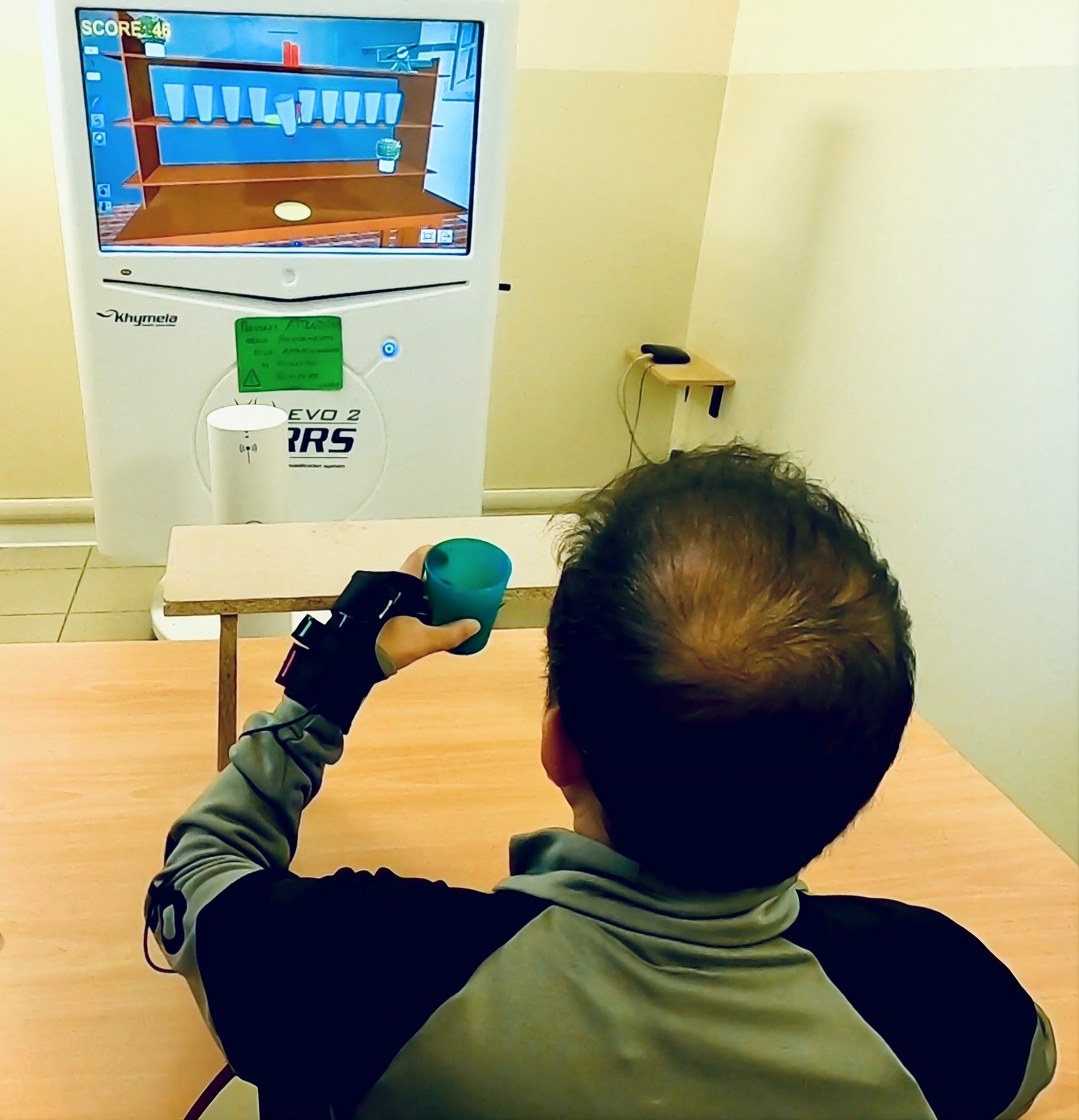 - Subito dopo, il/la paziente prova a eseguire la stessa azione in realtà virtuale, utilizzando il proprio braccio e la propria mano per quanto possibile. Il/la paziente manipola oggetti reali dotati di sensori, capaci di rilevare anche movimenti molto piccoli o incompleti. La realtà virtuale amplifica e rende visibili questi movimenti, restituendo sullo schermo davanti al/alla paziente un’azione più fluida e funzionale.