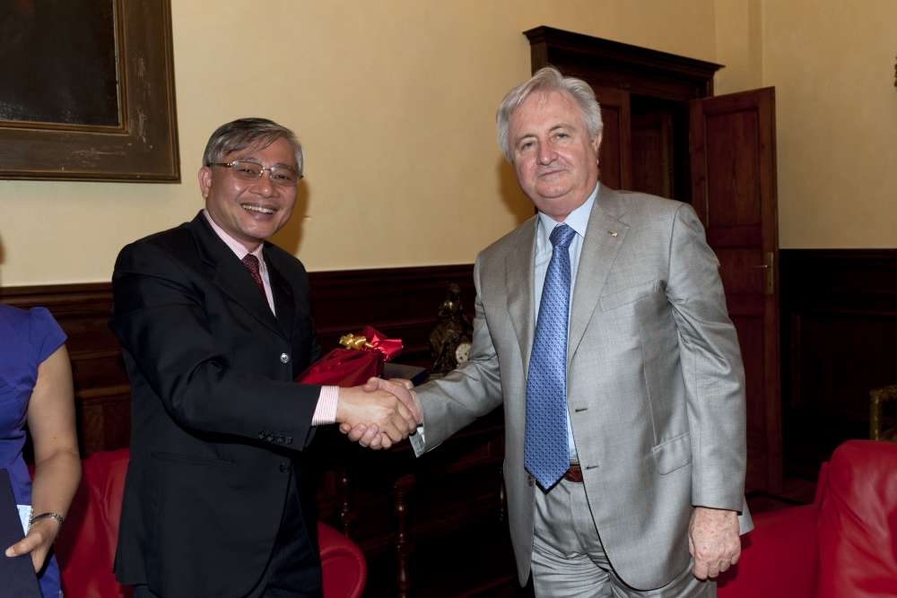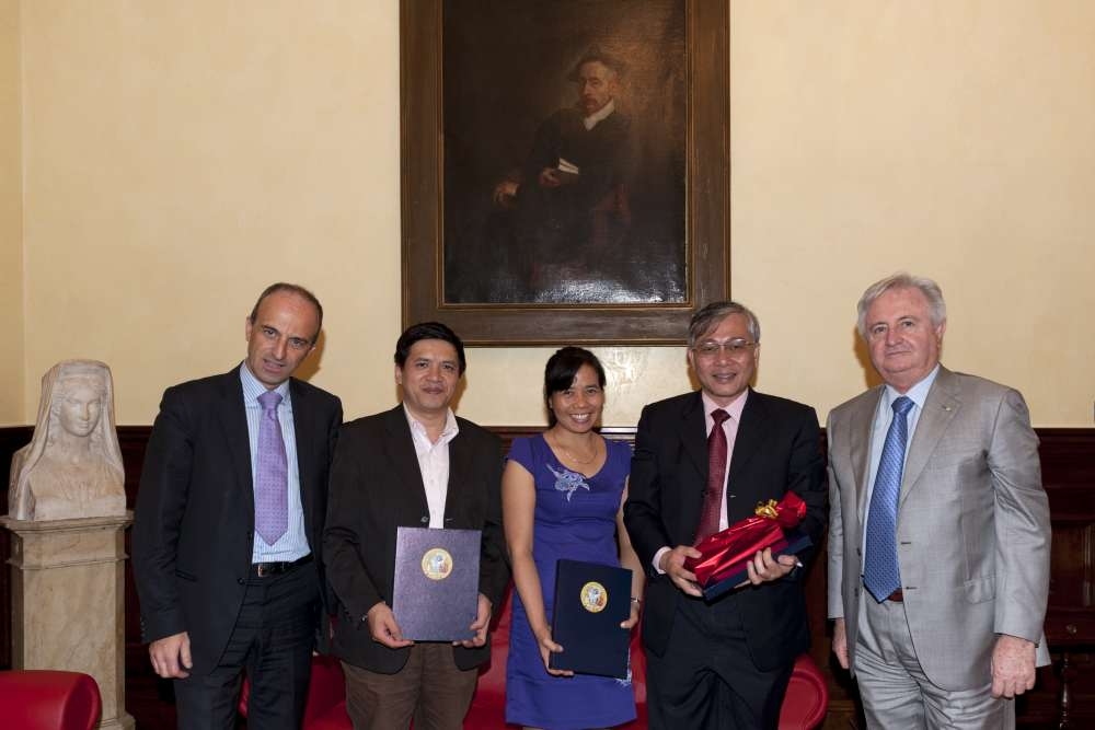 Parma 27 luglio 2012 – Nella mattina di giovedì 26 luglio, presso Il Rettorato dell’Università degli Studi di Parma, il Rettore, prof. Gino Ferretti, ha ricevuto la visita di una delegazione di professori della Hanoi Medical University (Vietnam), composta da Nguyen Duc Hinh, Presidente dell’Ateneo vietnamita, Le Thi Huong, Vice Direttore dell’Istituto per la prevenzione e la sanità pubblica e Pham Huy Tuan Kiet, docente.