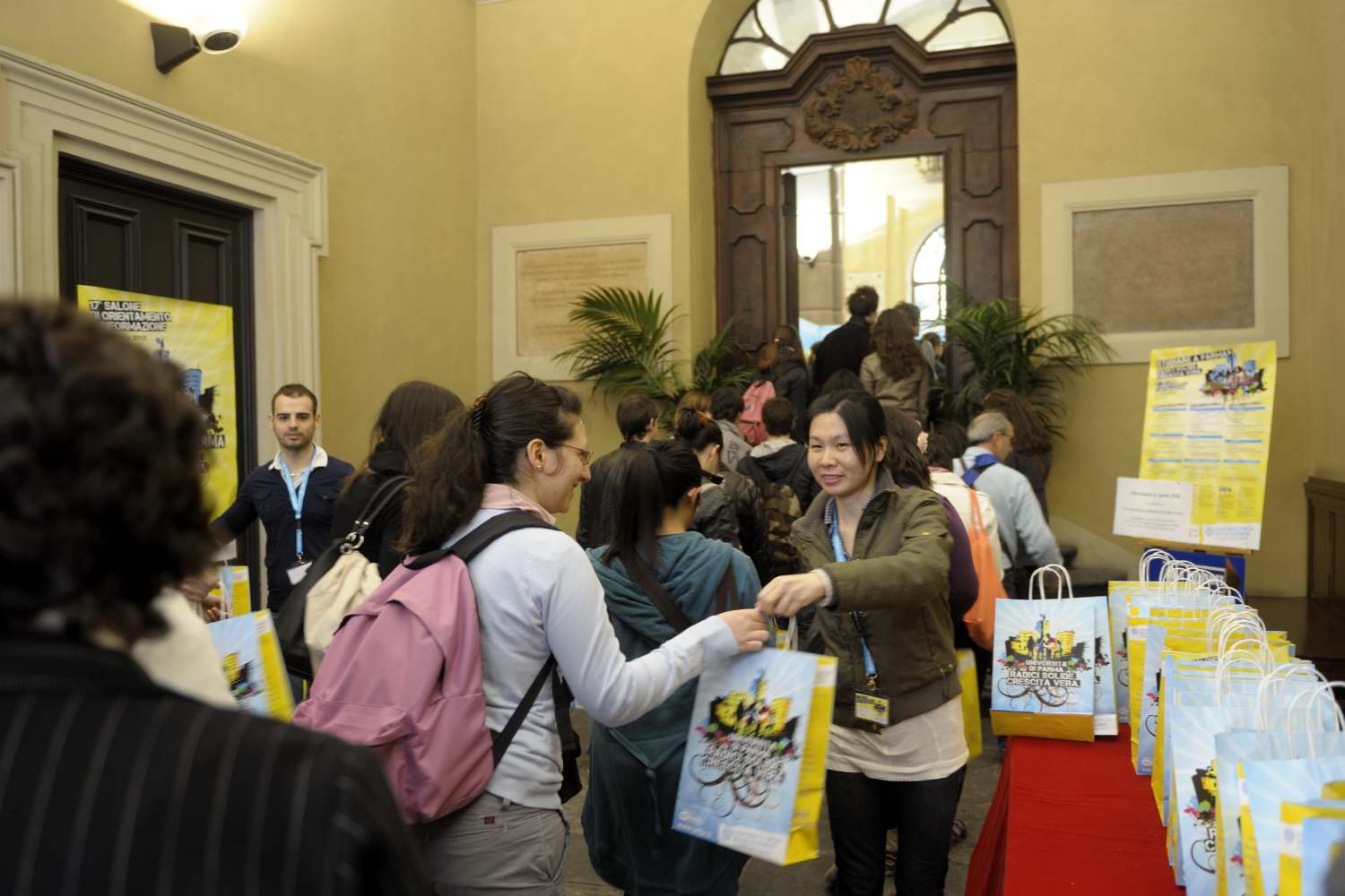 INAUGURATO IL 17° SALONE DI ORIENTAMENTO E INFORMAZIONE "STUDIARE A PARMA"Fino a venerdì 23 aprile aperti gli stand dell'Ateneo di Parma con orario continuato dalle 9 alle 18La prima giornata di apertura ha visto la presenza di circa 1400 visitatoriIl taglio del nastro da parte del Rettore Gino Ferretti, del Vicesindaco del Comune di Parma Paolo Buzzi e dell'Assessore Provinciale alle Politiche Scolastiche Giuseppe RomaniniStudenti all'esterno del SaloneVisitatori all'ingresso del SaloneOrari bus navetta per le visite alle Facoltà La diciassettesima edizione del Salone di Orientamento e Informazione "Studiare a Parma" è stata inaugurata oggi, alle 9, nel Palazzo Centrale dell'Università di Parma, e ha visto, nella sua prima giornata di apertura, la presenza di circa 1400 visitatori. Dopo il tradizionale taglio del nastro, che ha dato il via ufficiale alla manifestazione, il Rettore dell'Ateneo Gino Ferretti e le numerose autorità cittadine presenti hanno visitato gli stand delle Facoltà, dei servizi offerti dall'Ateneo parmense ai suoi studenti e di altre importanti realtà del territorio parmense.All'inaugurazione era inoltre presente, su invito delle Associazioni AVIS di Base Università, ADAS, AIDO, ADMO e ADISCO, la prima squadra al completo della società Rugby Parma.IL PROGRAMMA DI GIOVEDI' 22 APRILEINCONTRI DI PRESENTAZIONE DELLE FACOLTA'Nella giornata di giovedì 22 aprile, dalle 10 alle 16 si terranno in contemporanea, in Aula Magna e in Aula dei Filosofi, le presentazioni delle Facoltà dell'Ateneo: AGRARIA, ore 9.15, Aula dei Filosofi; ARCHITETTURA, ore 15, Aula Magna; ECONOMIA, ore 10, Aula Magna; FARMACIA, ore 12, Aula dei Filosofi; GIURISPRUDENZA, ore 12, Aula Magna; INGEGNERIA (Meccanica e Gestionale), ore 14, Aula Magna; LETTERE E FILOSOFIA, ore 11, Aula Magna (all'interno della presentazione sarà illustrato il Corso di Laurea Interfacoltà in Scienze dell'Educazione, attivato in collaborazione con le Facoltà di Giurisprudenza e Medicina e Chirurgia); MEDICINA E CHIRURGIA, ore 16, Aula Magna; alla fine della presentazione ADMO, AIDO, ADISCO, AVIS Università e ADAS parleranno agli studenti su "Uniti per il dono: un gesto per la vita"; MEDICINA VETERINARIA, ore 14, Aula dei Filosofi; PSICOLOGIA e Servizio PA.T.O.S., ore 9.15, Aula Magna; SCIENZE MATEMATICHE, FISICHE E NATURALI, ore 10, Aula dei Filosofi; SCIENZE POLITICHE, ore 15, Aula dei Filosofi. VISITE ALLE FACOLTA' E AI LABORATORI DI RICERCAI visitatori potranno inoltre recarsi direttamente presso alcune strutture didattiche e laboratori di ricerca. Questi gli appuntamenti di giovedì 22 aprile: Facoltà di Agraria (raggiungibile attraverso un bus navetta gratuito), dalle 11 alle 13: visita ai Laboratori di ricerca (ritrovo presso l'Edificio Chimico); Facoltà di Economia (raggiungibile a piedi dal Palazzo Centrale dell'Ateneo), ore 13: visita guidata alle strutture della Facoltà; Facoltà di Farmacia (raggiungibile attraverso un bus navetta gratuito), dalle 15 alle 17.30: visita alle strutture didattiche e ai Laboratori di ricerca; Facoltà di Medicina Veterinaria (raggiungibile attraverso un bus navetta gratuito), ore 10, Aula Informatica: incontro con gli studenti; Facoltà di Psicologia (raggiungibile a piedi dal Palazzo Centrale dell'Ateneo): è possibile visitare le strutture didattiche e di ricerca previo accordo con il servizio PA.T.O.S. del Dipartimento di Psicologia, aperto dal lunedì al venerdì dalle 11 alle 13 e dalle 15 alle 18 (tel. 0521 034910 info@serviziopatos.com); Facoltà di Scienze MM.FF.NN. (raggiungibile attraverso un bus navetta gratuito), dalle 15 alle 17: visita guidata alle strutture scientifiche e didattiche (ritrovo presso l'Edificio Polifunzionale per la Didattica).EVENTI E INCONTRIPER STUDENTI DISABILIGiovedì 22 aprile, dalle 9 alle 13, presso l'Aula dei Cavalieri, gli studenti con disabilità/invalidità e i loro genitori e tutor potranno incontrare la Prof.ssa Emilia Caronna, Delegata del Rettore alle Iniziative per studenti disabili e fasce deboli, per avere informazioni su quanto l'Università di Parma offre a studenti e studentesse con invalidità di qualsiasi percentuale e/o appartenenti alle fasce deboli.Alle 16, invece, sempre in Aula dei Cavalieri, ci sarà un incontro dal titolo "Officina della Creatività", in cui la Prof.ssa Emilia Caronna, i suoi collaboratori/ici, il Prof. Marco Silvestri e i suoi laureandi presentano, con "...barriers, barrières, barreras, barriere, in qualsiasi lingua, sempre barriere sono ", la Banca del Tempo "Gocce TemporAli", i cd-rom con le proposte di un Architetto per abbattere barriere e di laureandi in Ingegneria per non costruirle, il libricino "GIO-CA-pi-RE, togliamo il camice' alle parole", i Segnalibri di Telethon e del Darwin Day e il cd-rom con i servizi per gli studenti/esse con disabilità.Per tutta la durata del Salone sarà inoltre visitabile la Mostra sulle Barriere "...barriers, barrières, barreras, barriere, in qualsiasi lingua, sempre barriere sono ", organizzata in collaborazione con "Le Eli-Che", la Facoltà di Ingegneria, l'Agenzia disabili e la Consulta per le politiche a favore delle persone disabili del Comune di Parma.CUS PARMAGiovedì 22 è una giornata importante anche per gli appassionati di sport: l'appuntamento da non perdere è per le ore 17, in Aula dei Filosofi, quando il CUS Parma presenterà le attività rivolte agli studenti universitari e successivamente la rappresentativa che parteciperà ai Campionati Nazionali Universitari 2010 di Campobasso.MUSEO DI STORIA NATURALEInfine, anche per tutta la giornata di giovedì 22 aprile il Museo di Storia Naturale dell'Ateneo, che si trova al primo piano del Palazzo Centrale (Via Università 12), sarà aperto ai visitatori con orario continuato dalle 10 alle 18.CONFERENZA SU ENERGIE DOLCI E SVILUPPO SOSTENIBILE Per finire, alle 15, presso la Sala Conferenze dell'Edificio polifunzionale per la Didattica (Campus universitario), si svolgerà la conferenza-dibattit