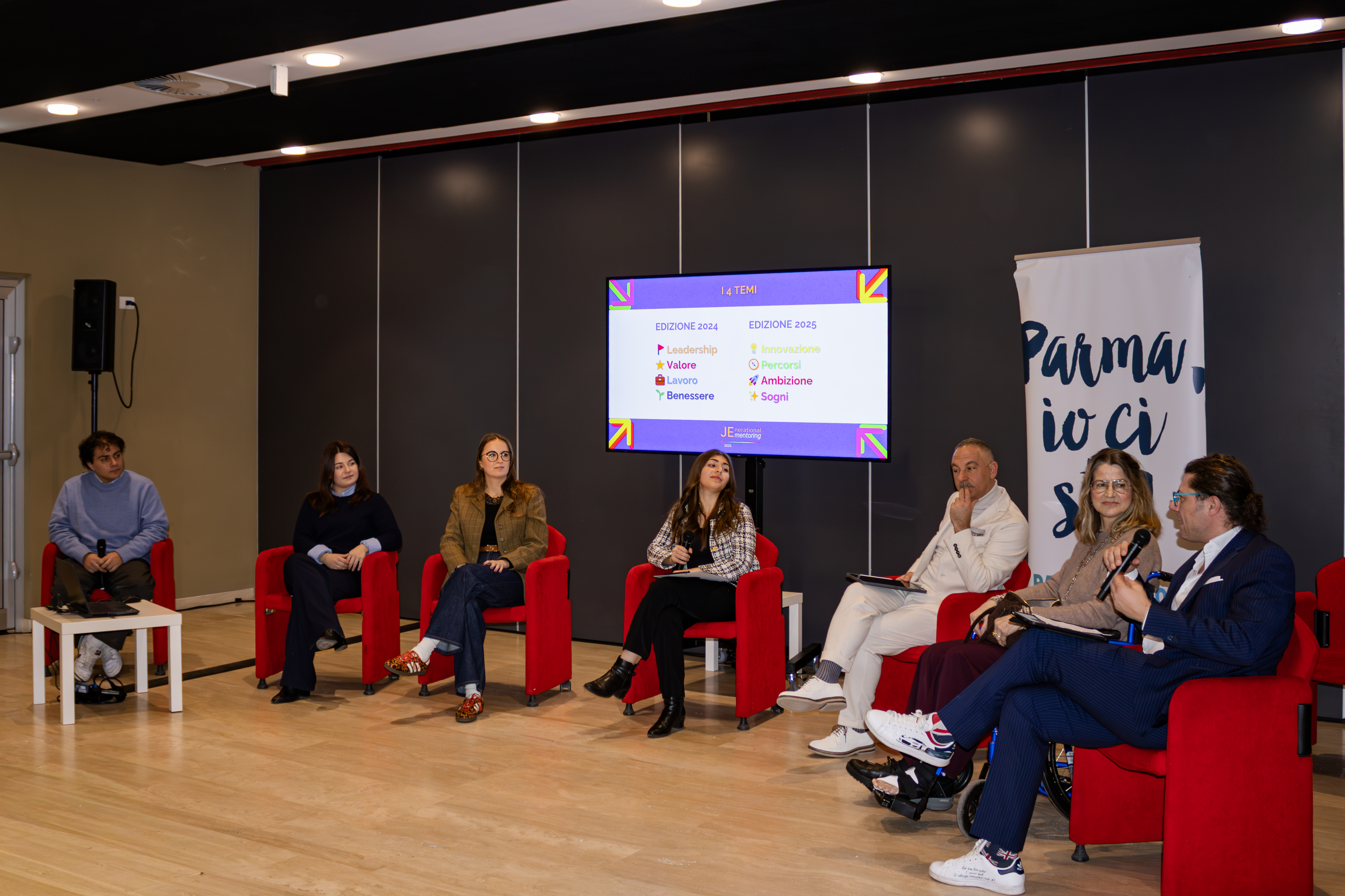 Nella seconda parte della tavola rotonda sono invece intervenuti i partecipanti e le partecipanti al progetto, tre senior, Gianluca De Biase, Gabriele Camisa ed Elisa Vacondio, e tre junior, Flavia Niccacci, Giulia Pardini e Daniele Maira, che si sono confrontate e confrontati con la moderatrice, Sara Ollari di Junior Enterprise Parma, raccontando i momenti più significativi della loro esperienza nel progetto JEnerational Mentoring.