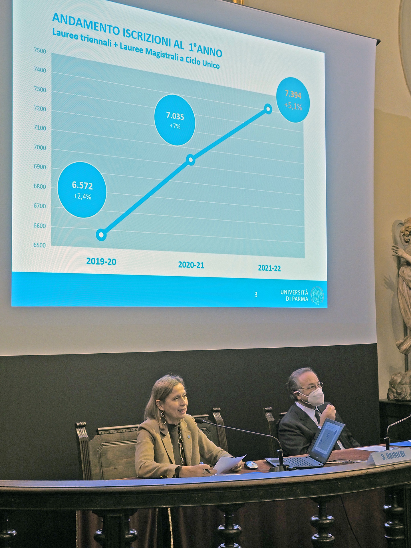 Parma, 13 dicembre 2021 – Ancora una crescita per l’Università di Parma: i dati delle iscrizioni al primo anno ai corsi triennali e magistrali a ciclo unico per il 2021-2022 mostrano che prosegue il trend positivo avviato già da diversi anni. L’incremento rispetto all’anno scorso è del +5,1%: 7.394 gli iscritti complessivi al primo anno (dati al 30 novembre 2021) contro i 7.035 dell’anno accademico 2020-2021, con una crescita assoluta di 359 matricole. Si conferma la forte attrattività dell’Ateneo fuori regione, con aumento della quota percentuale di studenti di Centro-Sud e Isole.I dati sono stati presentati questa mattina nella Sede centrale dell’Ateneo dal Rettore Paolo Andrei e dalla Pro Rettrice alla Didattica e Servizi agli Studenti Sara Rainieri. Entrambi hanno sottolineato il valore della continuità della crescita, tanto più significativa se si considera il difficile contesto generato dall’emergenza sanitaria e dall’onda lunga delle sue conseguenze anche economiche sulle famiglie. Proseguire nel trend positivo in un momento delicatissimo per il sistema universitario, e per il Paese nel suo complesso, è senz’altro molto confortante.I numeri parlano di aumento a doppia cifra (+15,9%) per il Dipartimento di Discipline Umanistiche, Sociali e delle Imprese Culturali – DUSIC, per il Dipartimento di Medicina e Chirurgia (+14,7%), che beneficia dei nuovi iscritti di Medicine and Surgery (al debutto quest’anno e quindi senza confronto con il 2020-21), e per il Dipartimento di Ingegneria e Architettura (+13,2%), che invece ha al debutto Design Sostenibile per il Sistema Alimentare (71 nuovi iscritti). Segue il Dipartimento di Scienze Chimiche, della Vita e della Sostenibilità Ambientale con una crescita del 9,4%, mentre gli altri Dipartimenti sono per quest’anno accademico caratterizzati da dati stazionari o in lieve calo.Tra i corsi, aumenti rilevanti per Ingegneria delle tecnologie informatiche (da 50 a 98 matricole: +98%), Scienze dell’educazione e dei processi formativi (da 430 a 583: +35,6%), Comunicazione e media contemporanei per le industrie creative (da 330 a 390: +18,2%).Guardando poi ai valori assoluti, le iscrizioni ai corsi di laurea triennali e magistrali a ciclo unico del nuovo anno accademico hanno superato le 1.000 unità nei seguenti Dipartimenti: Discipline Umanistiche, Sociali e delle Imprese Culturali (1.640), Scienze Economiche e Aziendali (1.254), Medicina e Chirurgia (1.064) e Ingegneria e Architettura (1.031).Provenienze: l’Ateneo conferma la sua forte attrattività fuori regione. Crescono Centro-Sud e IsoleL’Università di Parma si conferma fortemente attrattiva per i fuori regione, che passano dal 40,9% del 2020-21 al 45,8% di quest’anno. Aumenta la quota di studenti provenienti dal Centro-Sud (15,8% contro il 12,7% del 2020-21) e dalle Isole (6,4% contro 4,8%), quella del Nord Italia resta praticamente invariata (da 23,4% a 23,7%) mentre calano le quote dell’Emilia-Romagna (da 58,5% a 53,1%) e di Parma (da 31,4% a 26,6%). La Lombardia, con il 16,4%, è la regione percentualmente più presente dopo l’Emilia-Romagna, a seguire Sicilia (5,5%) e Puglia (5,1%).Studenti con cittadinanza straniera al 5,2%Gli studenti con cittadinanza straniera si attestano al 5,2%. La maggior parte, il 4,1%, provengono da paesi extra UE. Tra i principali paesi esteri di provenienza al primo posto la Romania (0,9%), seguita da Albania e Moldova (entrambe allo 0,5%).Genere: le donne sono il 60%Aumenta ancora, di un punto percentuale, la quota delle studentesse, che tra gli iscritti al primo anno “battono” gli studenti 60% a 40%. Tra i Dipartimenti più “gettonati” dalle ragazze, a livello percentuale, in cui si supera l’80% di iscritte al primo anno, troviamo il Dipartimento di Discipline Umanistiche, Sociali e delle Imprese Culturali – DUSIC (82%), seguito dal Dipartimento di Giurisprudenza, Studî politici e internazionali (71%) e dal Dipartimento di Scienze Medico-Veterinarie (67%). Resta invece preponderante la componente maschile ai Dipartimenti di Scienze Matematiche, Fisiche e Informatiche (75% di studenti iscritti al primo anno) e di Ingegneria e Architettura (69%).Il Dipartimento in cui, tra gli iscritti al primo anno, la presenza maschile e quella femminile sono più bilanciate è quello di Scienze Economiche e Aziendali: studenti al 47%, studentesse al 53%.Diritto allo studio: per le matricole in graduatoria per le borse di studio a Parma la crescita più alta in regioneDecisamente significativi i dati relativi al diritto allo studio. Le domande presentate per le borse di studio Er.Go sono aumentate del 4,68% in un anno, a fronte di un calo regionale dello 0,18%. Anche per quanto riguarda le graduatorie delle borse di studio, Parma cresce dell’1,66% contro un calo regionale dell’1%. Per le matricole in graduatoria per le borse di studio, infine, Parma fa registrare un +19,64%, contro l’1,88 della regione, con la crescita maggiore di tutta l’Emilia-Romagna.Inclusione: Parma resta punto di riferimentoL’Università di Parma, con il servizio Le Eli-Che del Centro Accoglienza e Inclusione, si conferma punto di riferimento importante anche per gli studenti appartenenti a fasce deboli, per i quali è attivo da anni un servizio che ha una lunga e consolidata tradizione con specifiche strutture di affiancamento e accoglienza. I numeri 2021-2022 parlano di 503 iscritti, a fronte dei 379 del 2020-21. Lauree magistrali: i dati a primaveraI dati anticipati oggi sono ancora parziali, poiché le iscrizioni ai corsi di laurea magistrale sono ancora aperte. Ad oggi gli iscritti alle magistrali sono 2.212, ma è naturalmente presto per tirare le somme. Le cifre complessive degli iscritti al primo anno (compresi quelli delle lauree magistrali) saranno disponibili nella primavera 2022.«L’Università di Parma – commenta il Rettore Paolo Andrei – conferma la sua capacità di attrazione e accoglienza, e questo per noi è moti