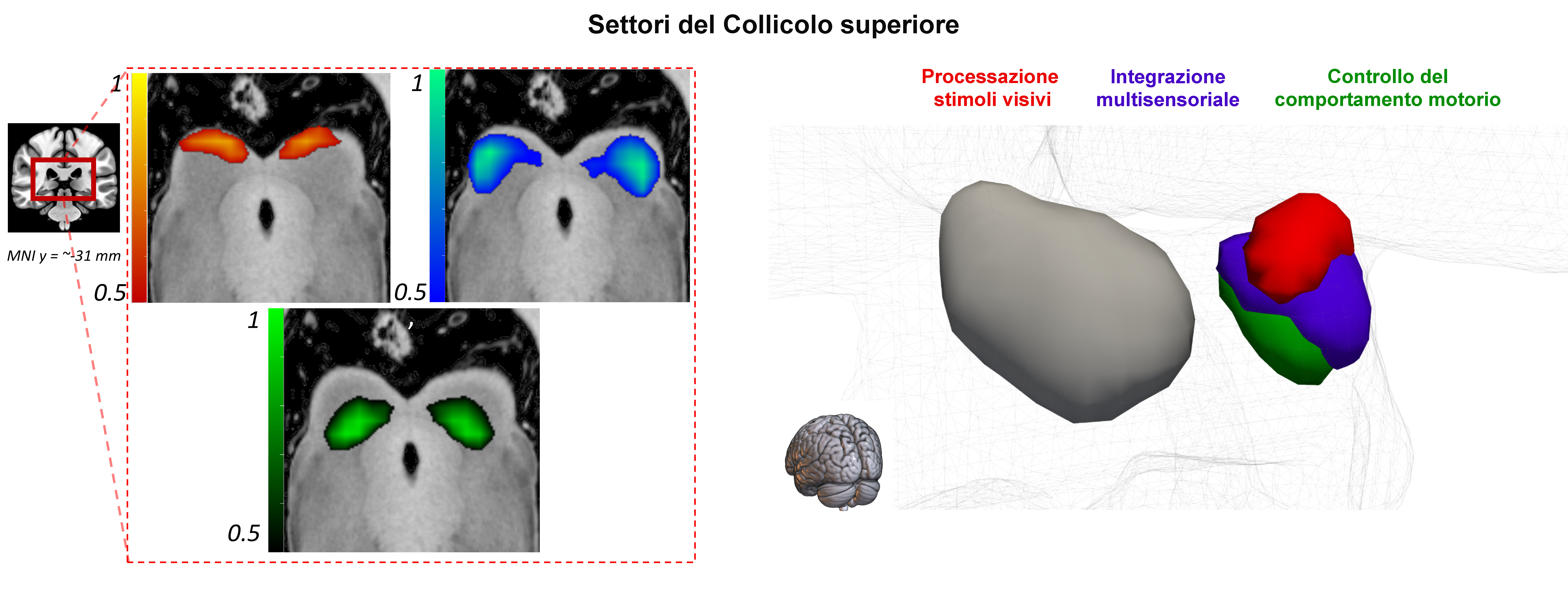 Il collicolo superiore umano è una struttura sottocorticale nota per integrare stimoli visivi con informazioni provenienti da altre modalità sensoriali, al fine di controllare il comportamento motorio, in particolare i movimenti oculari. In questo lavoro il team di ricerca ha dimostrato per la prima volta nell’uomo, mediante tecniche non invasive di trattografia e risonanza magnetica funzionale combinate con approcci analitici avanzati, l’esistenza di un’organizzazione dorso-ventrale della struttura, risultata suddivisibile in tre settori distinti, ciascuno caratterizzato da specifiche proprietà connettive e funzionali.