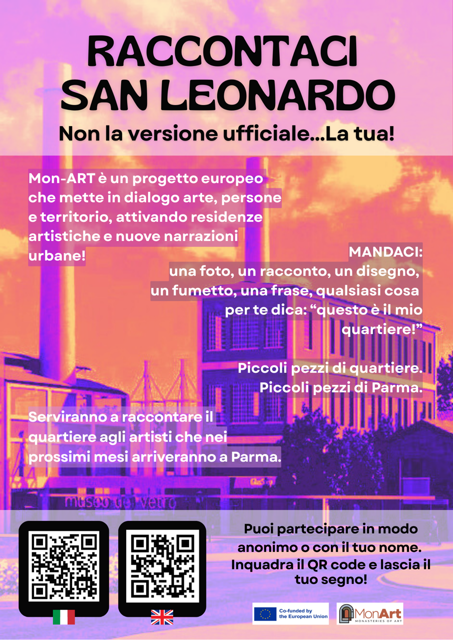 Nel corso della conferenza stampa sono stati illustrati il progetto, il contesto, le finalità e le modalità di partecipazione alla selezione degli artisti e delle artiste che lavoreranno per attivare dinamiche di rigenerazione culturale sul territorio di Parma. È stata inoltre presentata l’iniziativa “Raccontaci San Leonardo”, rivolta a giovani artiste/i della città e finalizzata a raccogliere materiali e documentazioni per presentare il quartiere ad artiste e artisti da selezionare, visto che è principalmente su quel quartiere che la residenza insisterà.