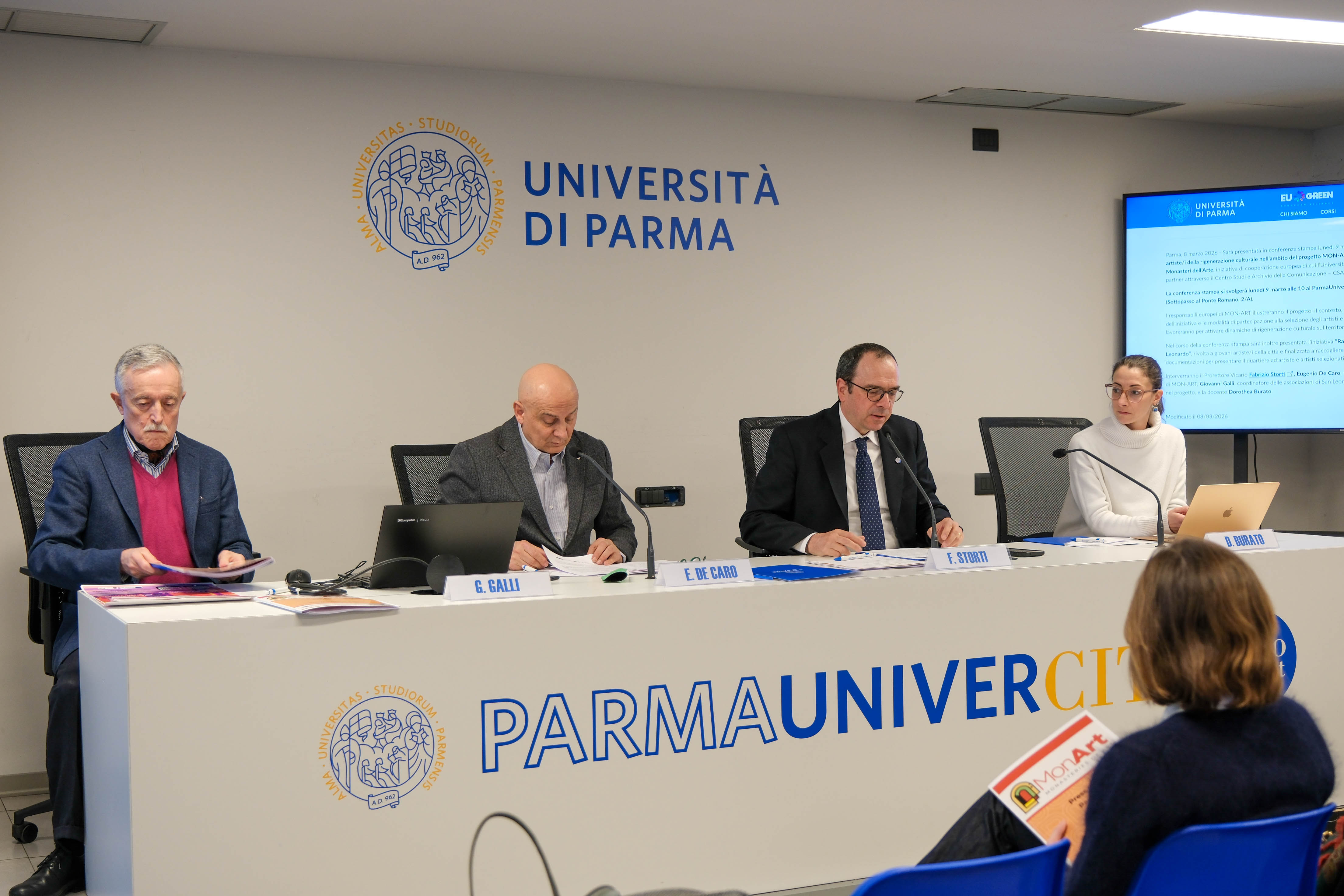 Sono intervenuti il Prorettore Vicario dell’Università di Parma Fabrizio Storti, Eugenio De Caro, Project Manager di MON-ART, Giovanni Galli, coordinatore delle associazioni di San Leonardo coinvolte nel progetto e la docente Dorothea Burato. Presenti anche Maria Vittoria Alpi di CSAC, Lucia Cucciarelli e Marzia Morteo, rispettivamente Communication Manager e Quality Manager del progetto, e Simonetta Venturini, direttrice artistica della residenza.