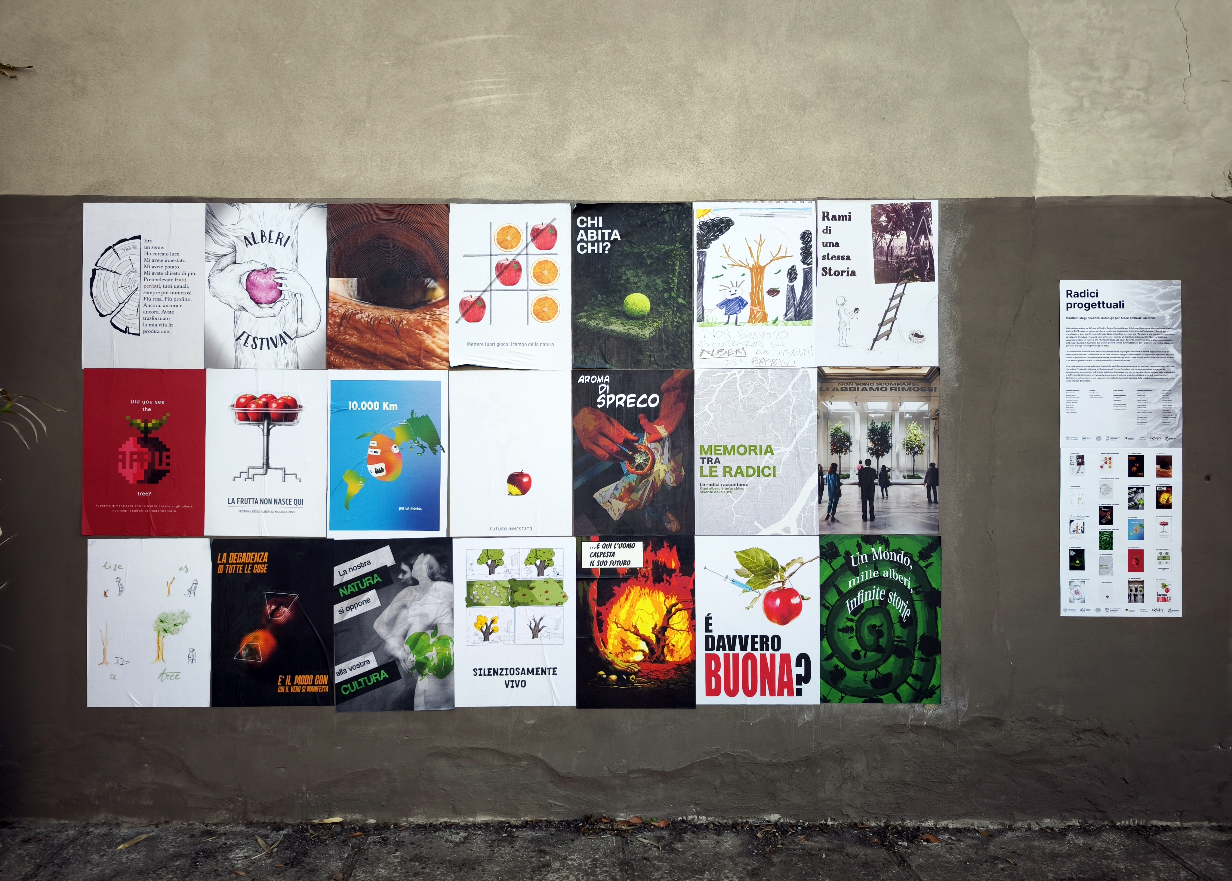 La mostra Radici Progettuali è il risultato di un concorso interno all’Università di Parma rivolto a studentesse e studenti del primo anno del corso triennale in Design sostenibile per il sistema alimentare, in collaborazione con Alberi Festival, per la progettazione di un manifesto con tecnica libera sul tema degli alberi da frutto.