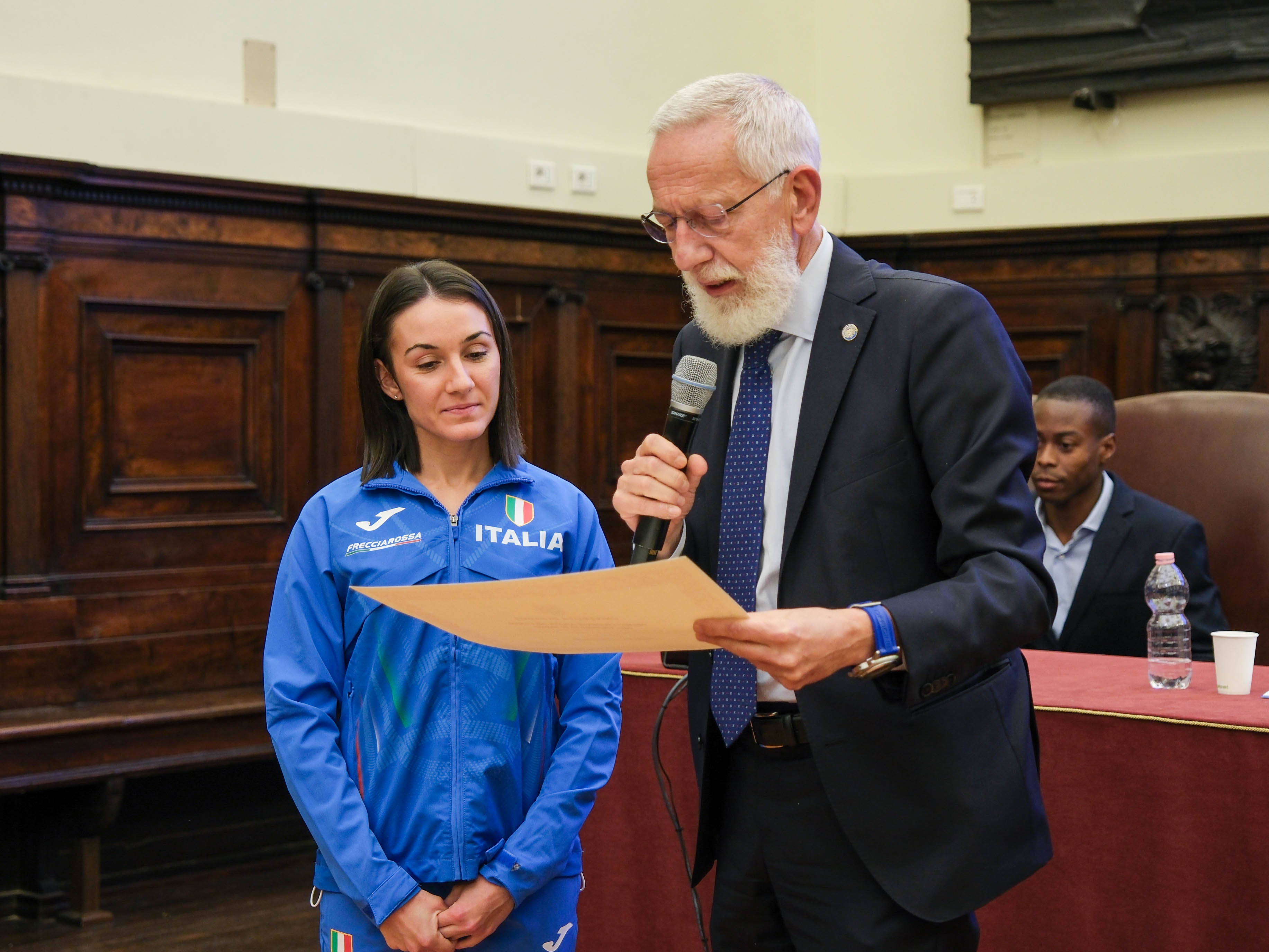 Sara Nestola è stata premiata dal Rettore Paolo Martelli e anche dal CUS Parma, che con il Presidente Iacopo Tadonio le ha consegnato un voucher per attrezzatura tecnica Lacertosus.