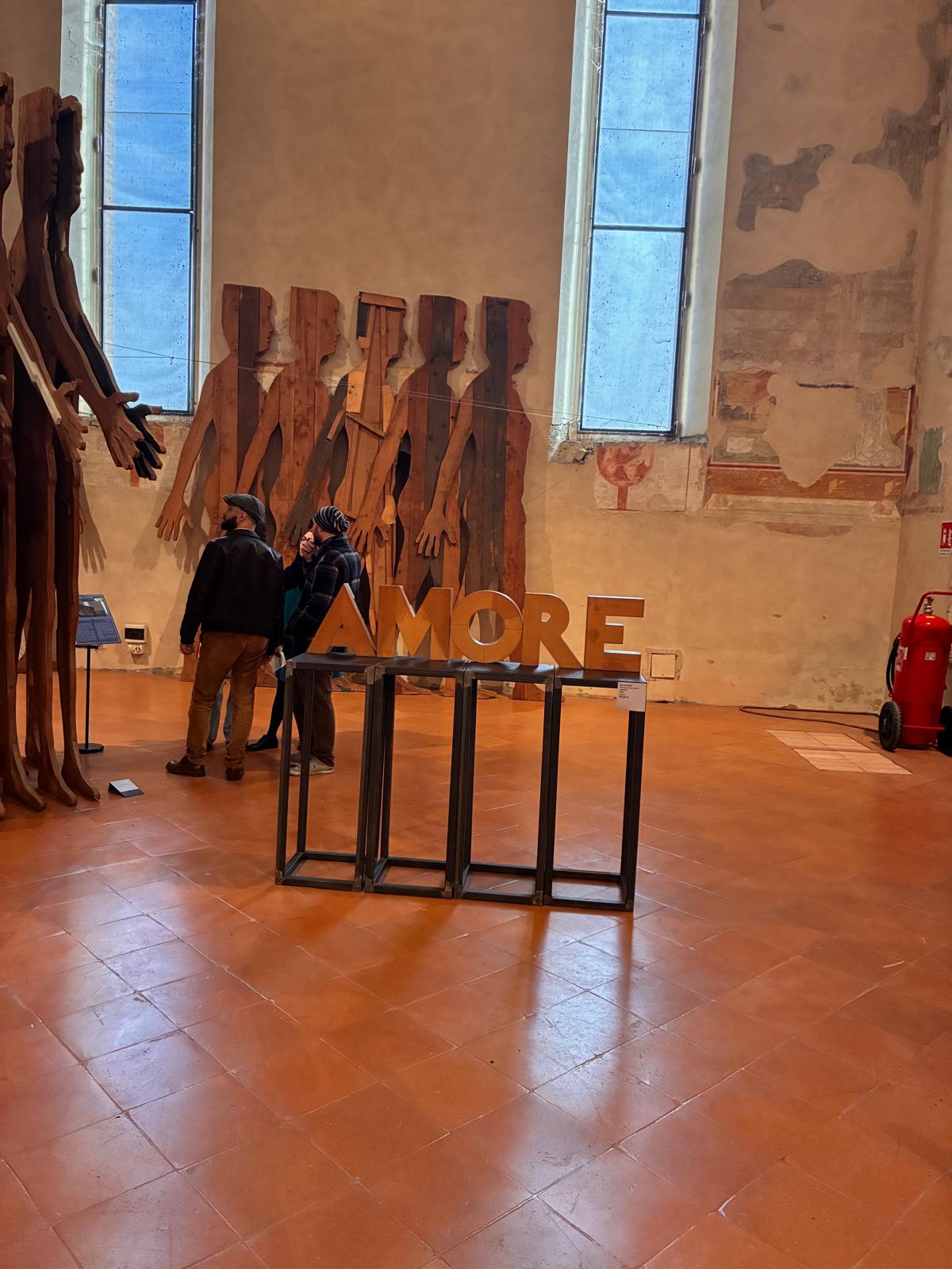 Pensato per lasciare libera la navata dell’Abbazia, l’intervento consente di ammirare la straordinaria architettura cistercense e, al contempo, di immergersi in un racconto visivo della creatività italiana del Novecento e del contemporaneo.