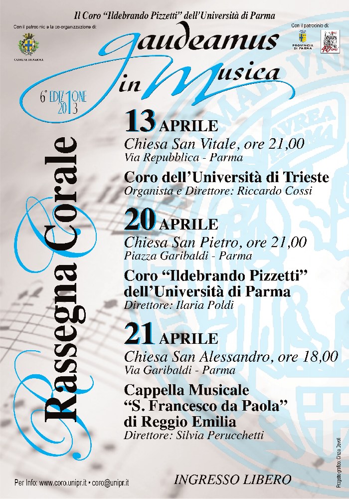 - sabato 20 aprile, ore 21, Chiesa di San Pietro (p.zza Garibaldi – Parma), Coro "Ildebrando Pizzetti" dell'Università di Parma, direttore M° Ilaria Poldi.