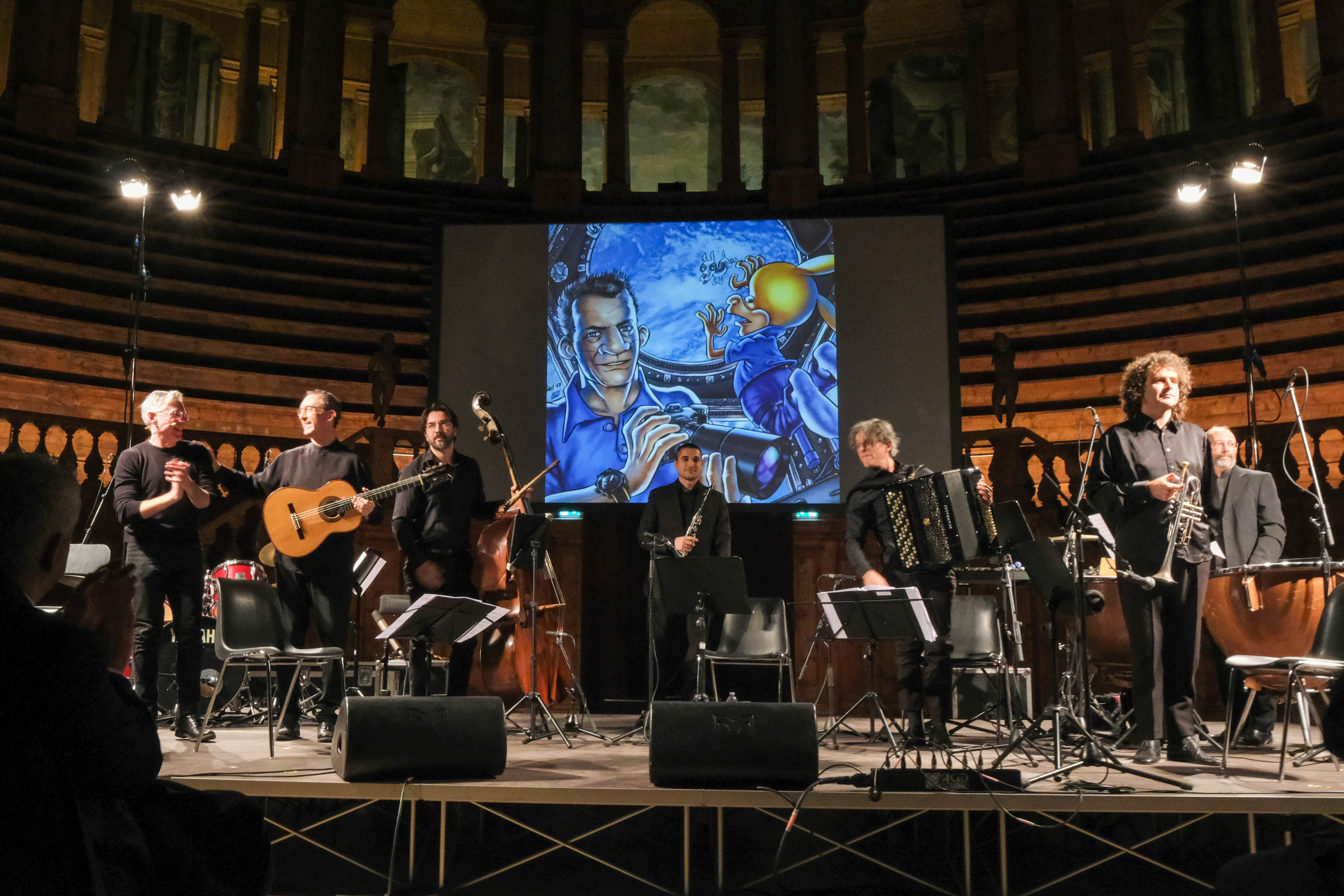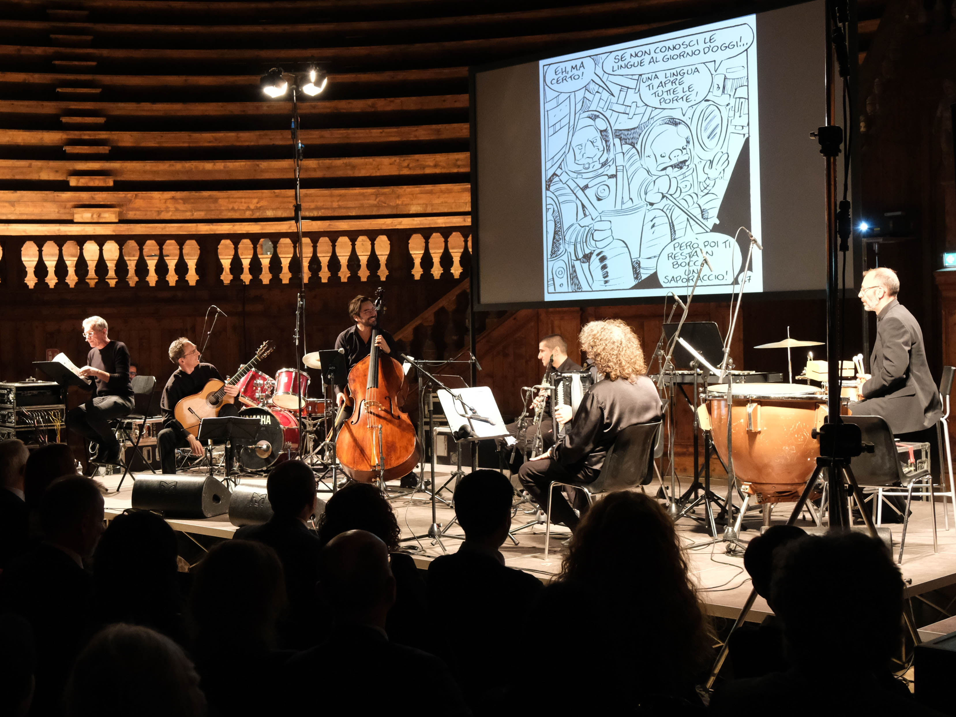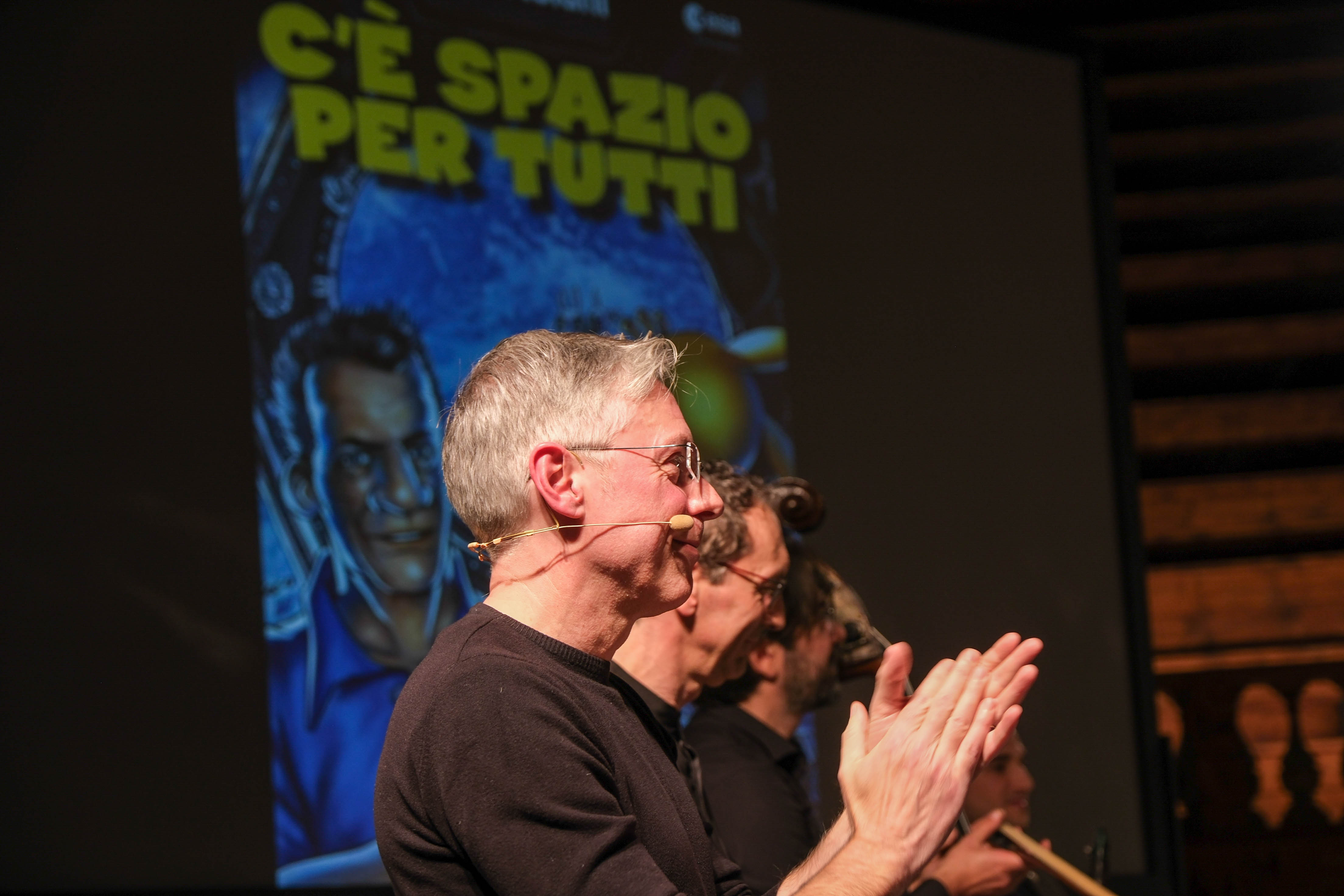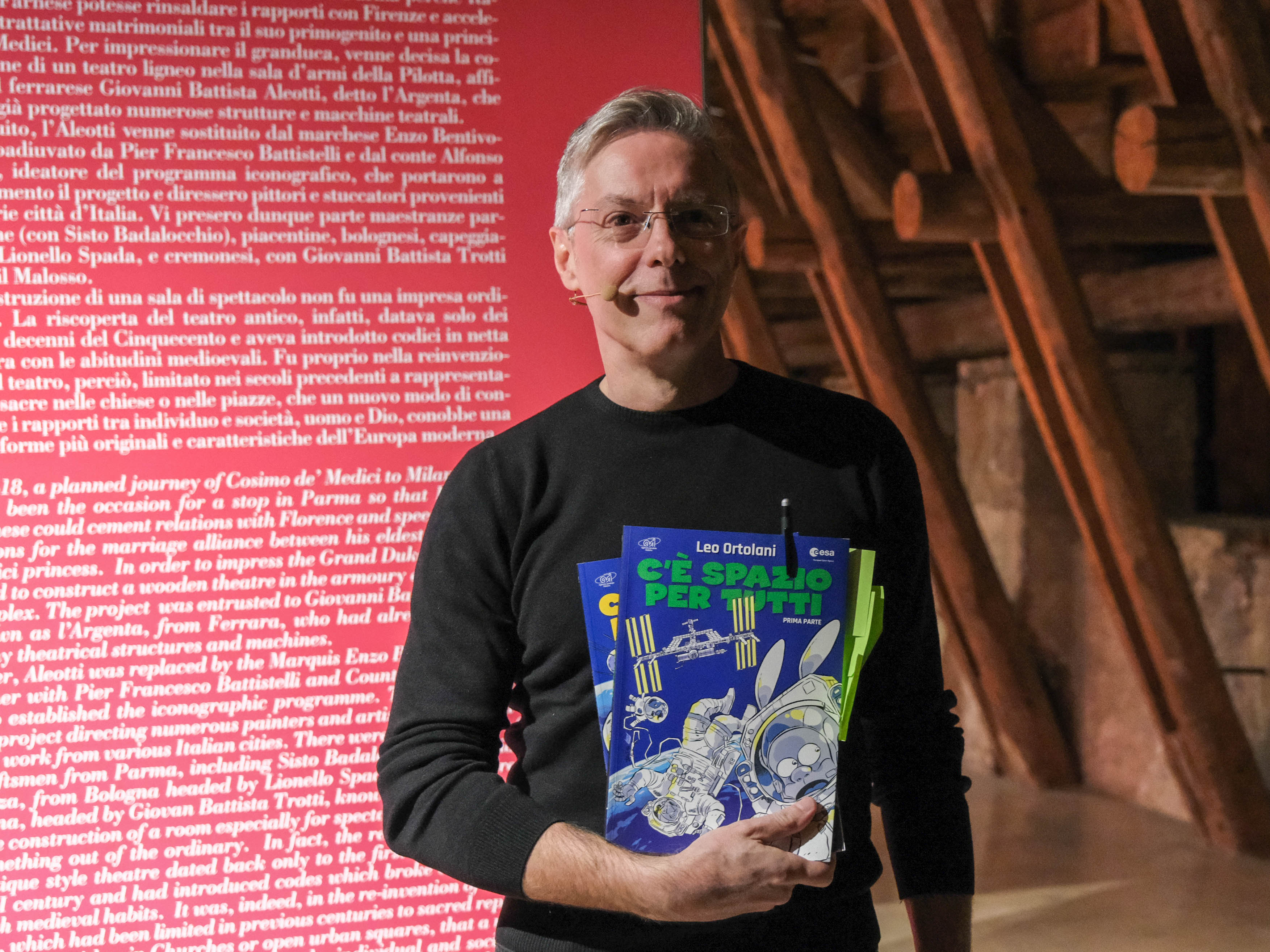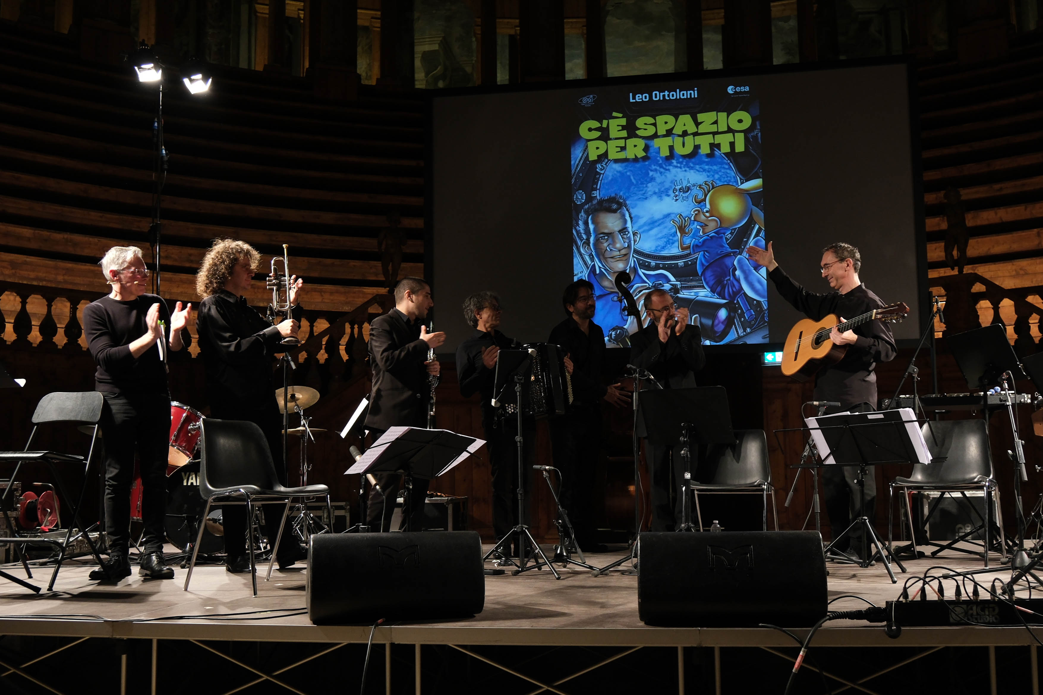 C’è spazio per tutti – La conquista dello spazio tra risate stellari e galassie sonore il titolo della serata, aperta dai saluti del Rettore Paolo Martelli, del Presidente della Società dei Concerti Davide Battistini e di Carla Campanini del Complesso monumentale della Pilotta
