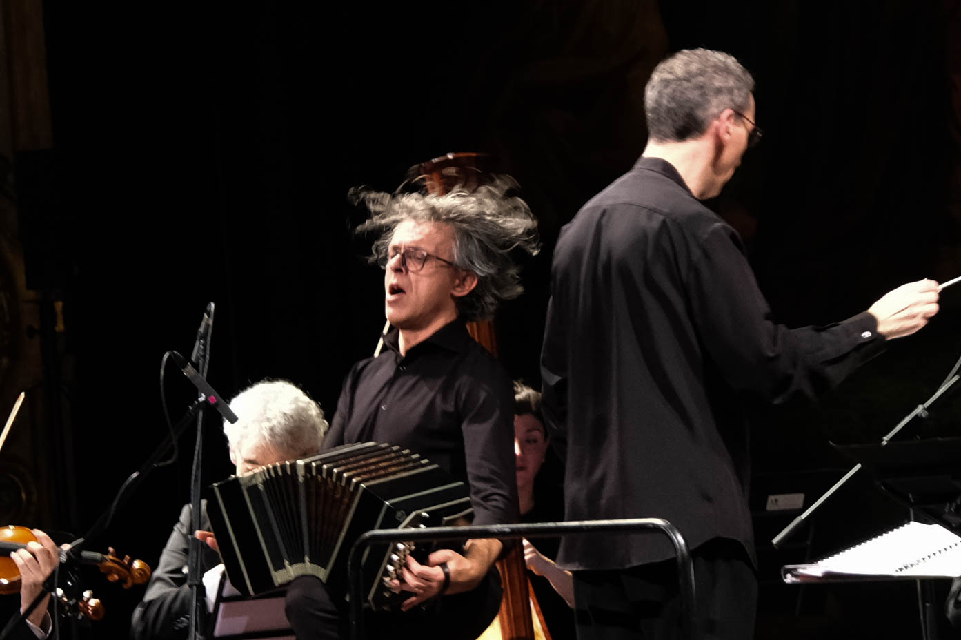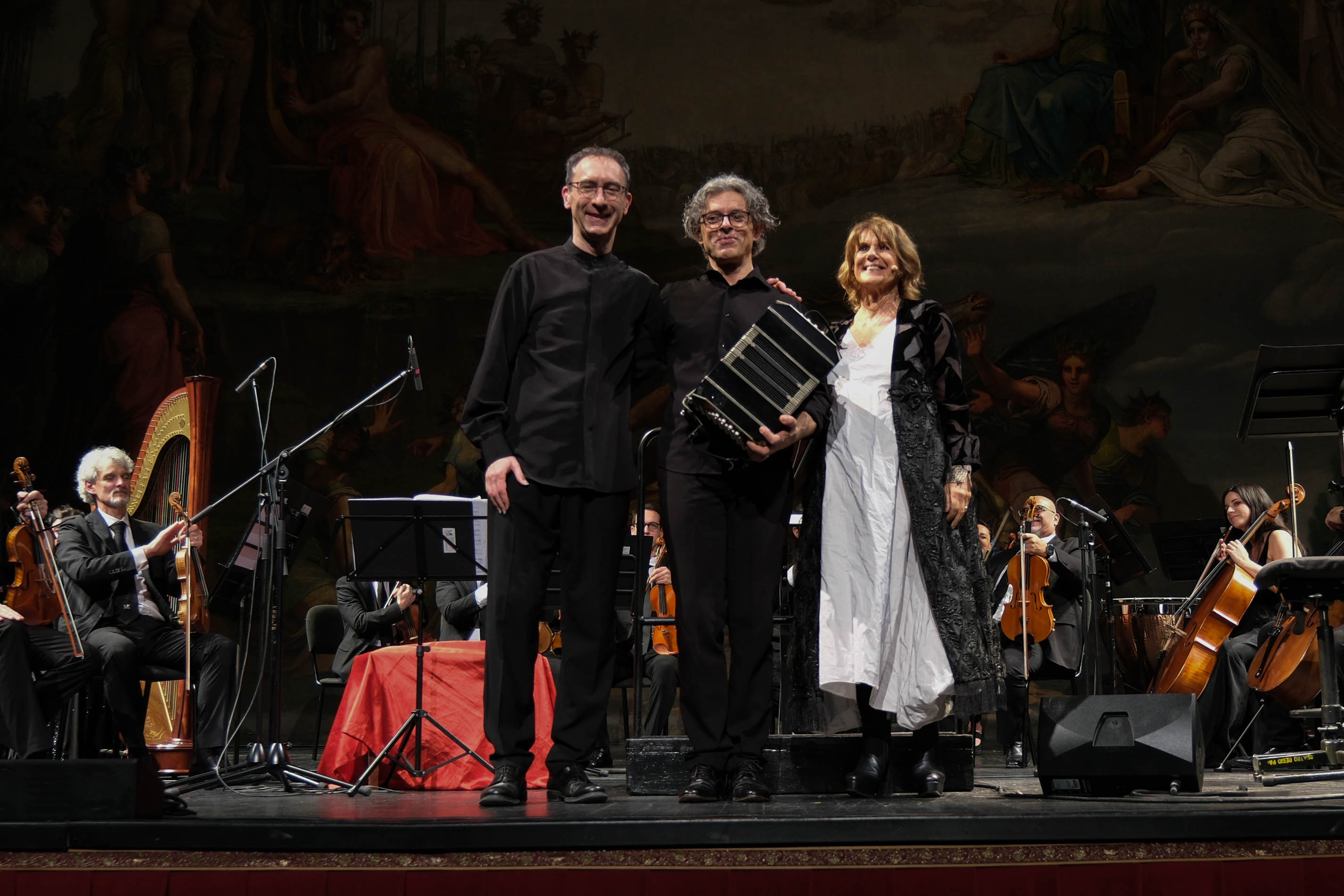 A tessere il filo della narrazione, non come semplice “accompagnamento” ma entrando esse stesse nella sintassi narrativa, le musiche di Astor Piazzolla proposte da Cesare Chiacchiaretta al bandoneon e dai Musici di Parma, in un dialogo perfetto con le parole capace di amplificarne le risonanze emotive.