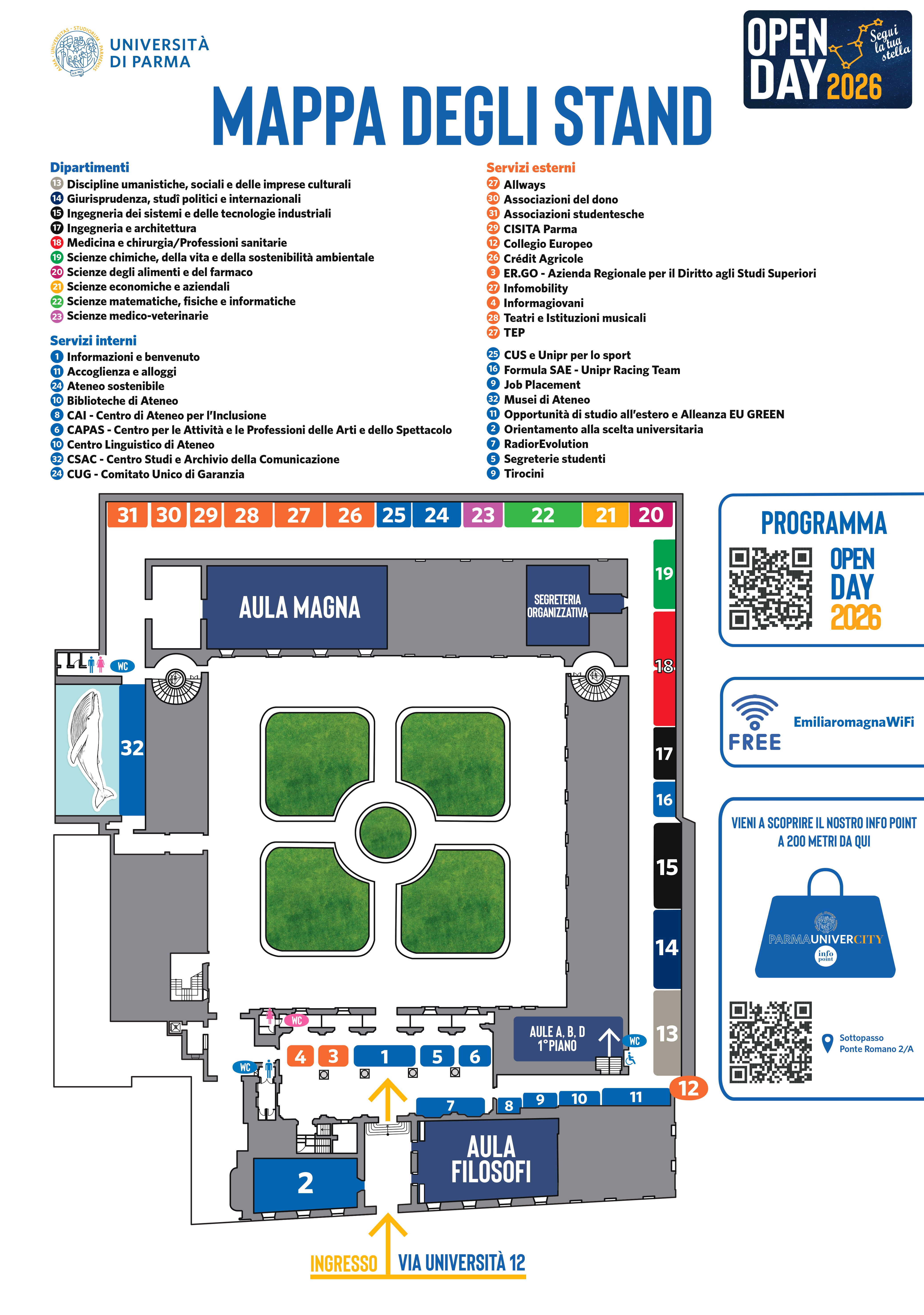 Informazioni e benvenuto: all'inizio del percorso del Salone, in Atrio delle Colonne, troverai lo stand del servizio Comunicazione istituzionale e cerimoniale dell'Università, che organizza l'evento: qui potrai ottenere tutte le informazioni utili sull'Open day e ritirare, se ti occorre, l'attestato di partecipazione al termine della visita.