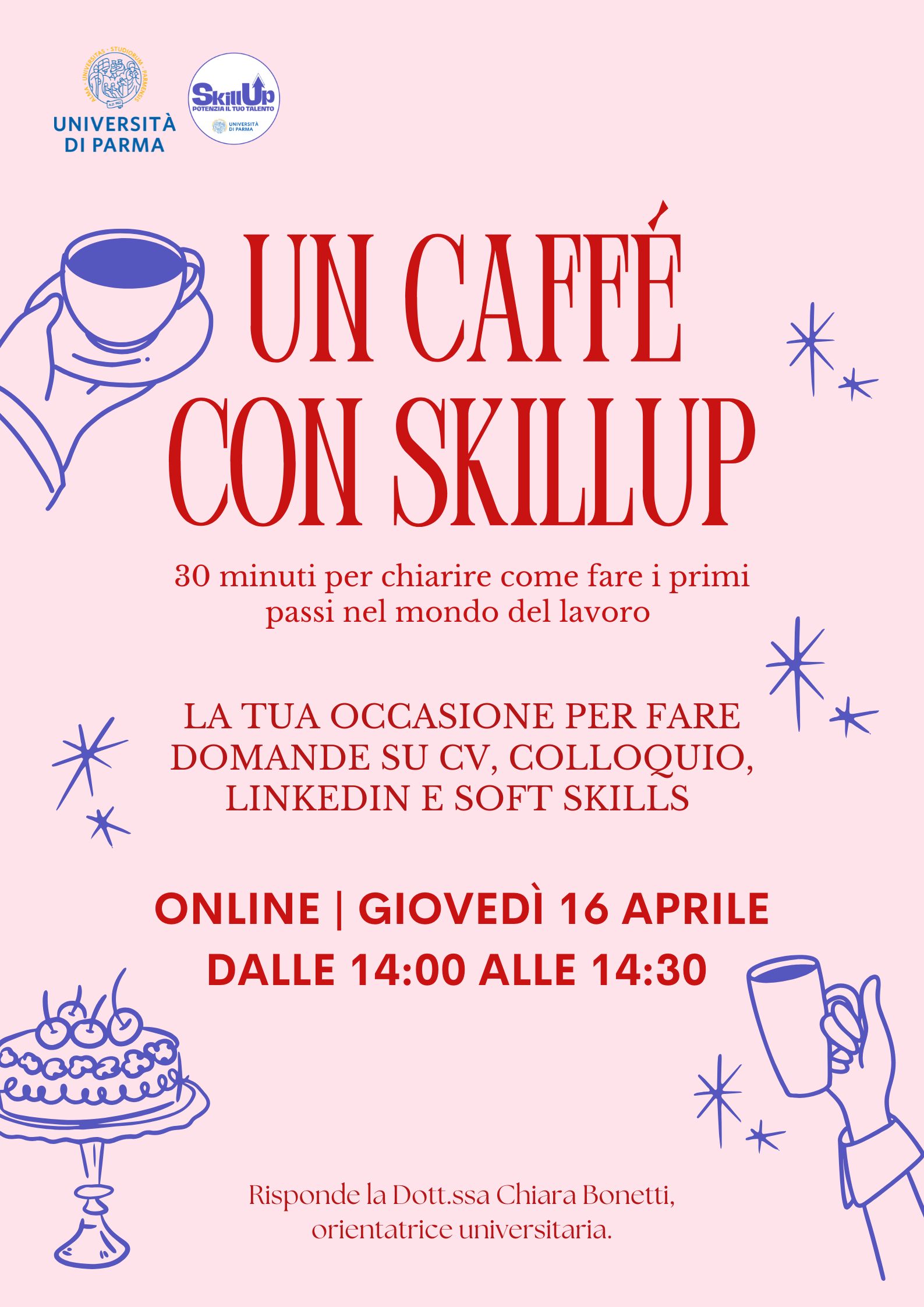 A guidare l’incontro sarà Chiara Bonetti, responsabile del servizio di orientamento SkillUp, che condividerà suggerimenti utili per costruire il tuo profilo professionale e affrontare con maggiore sicurezza i prossimi passi.